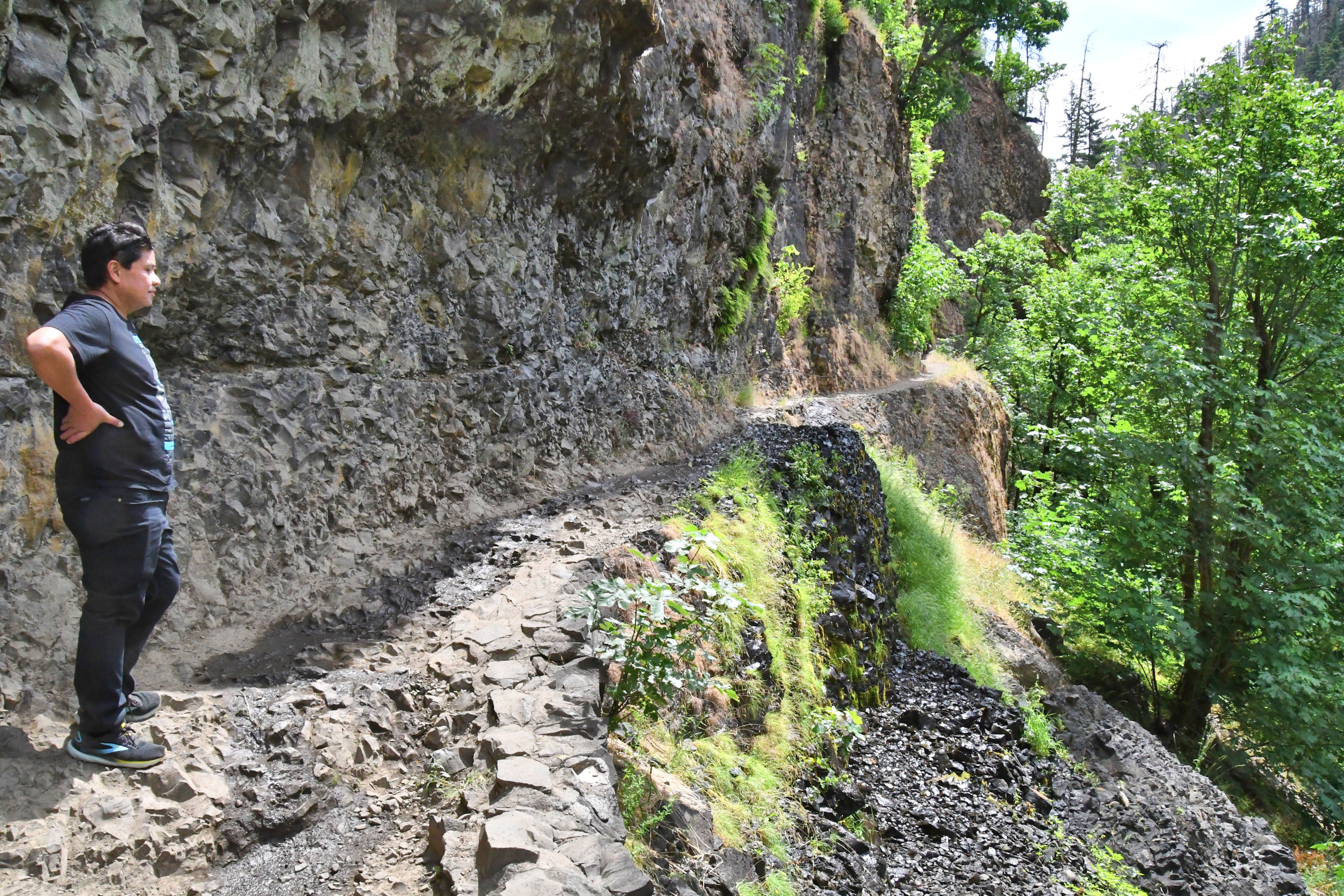 In several places there is a cable attached to the rock wall to hold onto for safety. We both used the cable.