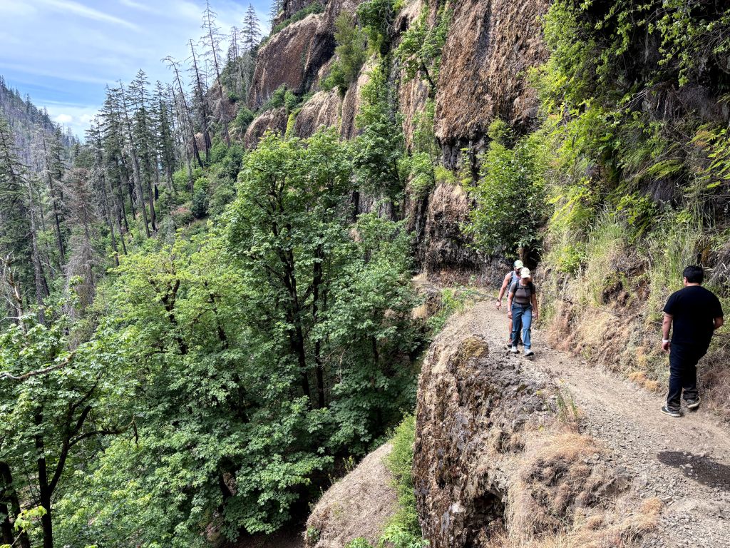 People hiking along the Eagle Creek Trail, with Eagle Creek far below and burned trees all around.