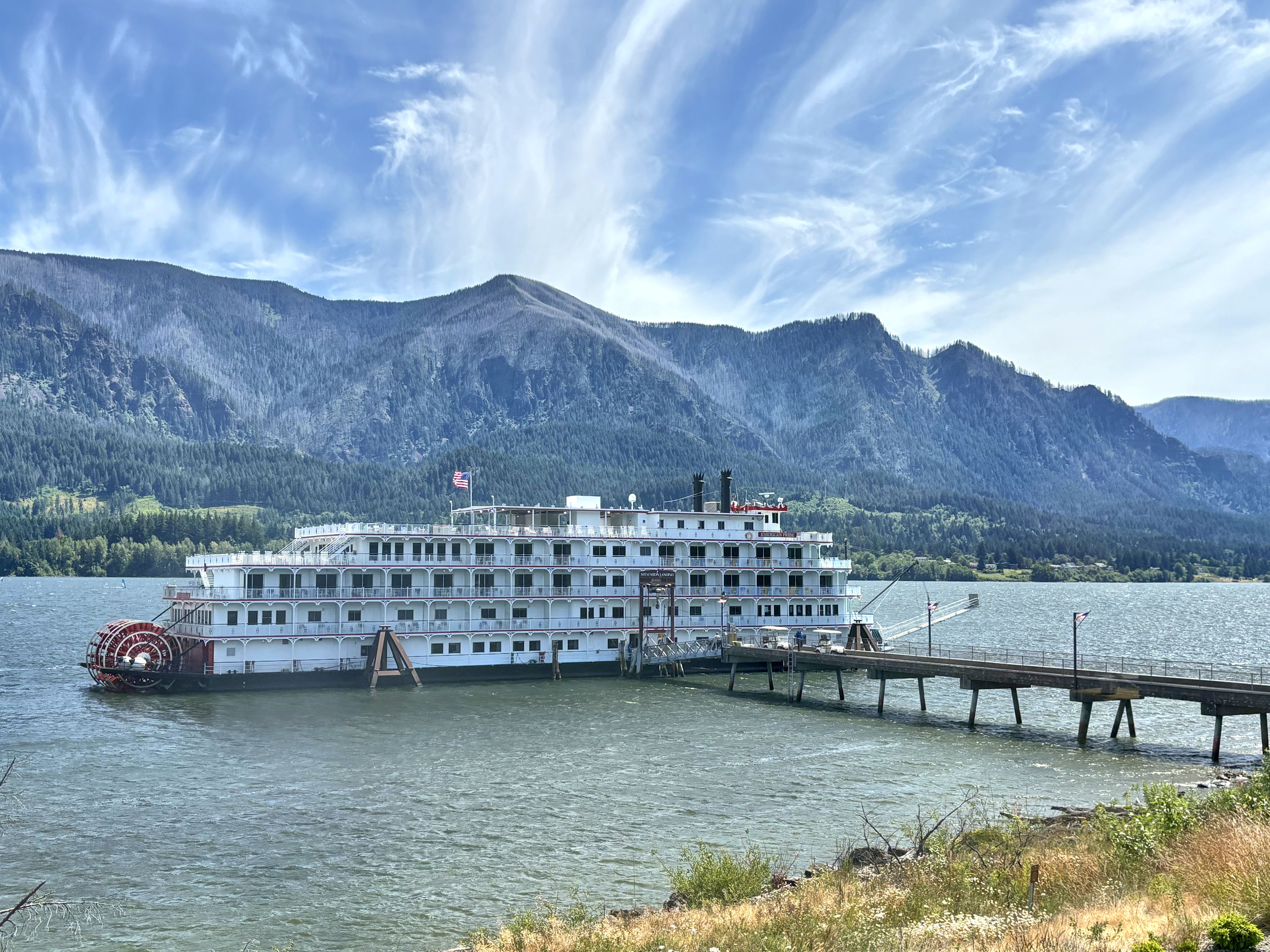 The view from our table, looking past the paddlewheel ship to the Oregon side of the river, where you can see thousands of acres of silvery dead tree stumps on the slopes.