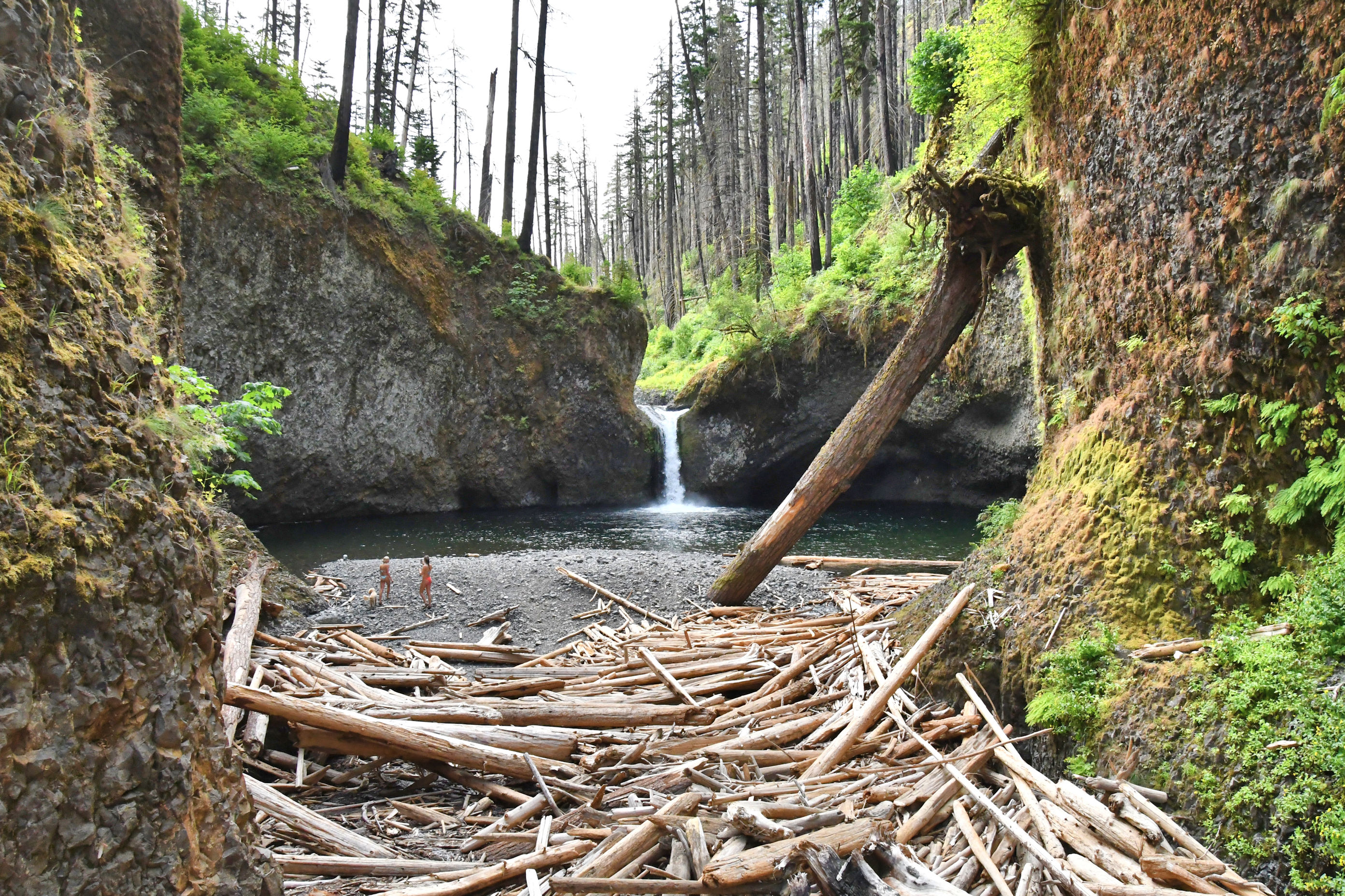 There is an enormous pile of dead trees washed into the gap between Lower and Upper Punchbowl Falls. I was determined to cross it.