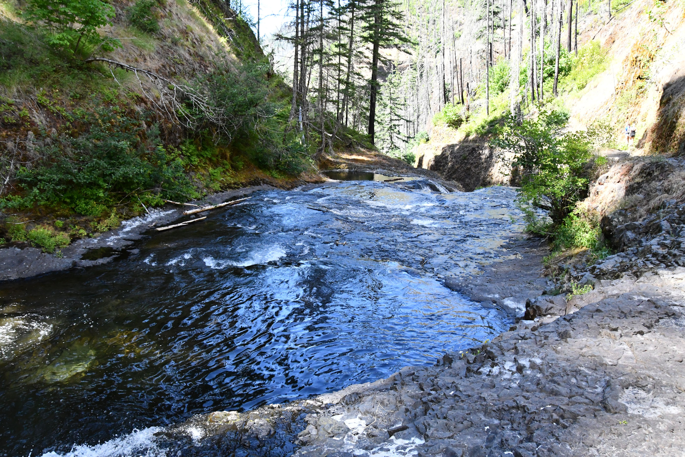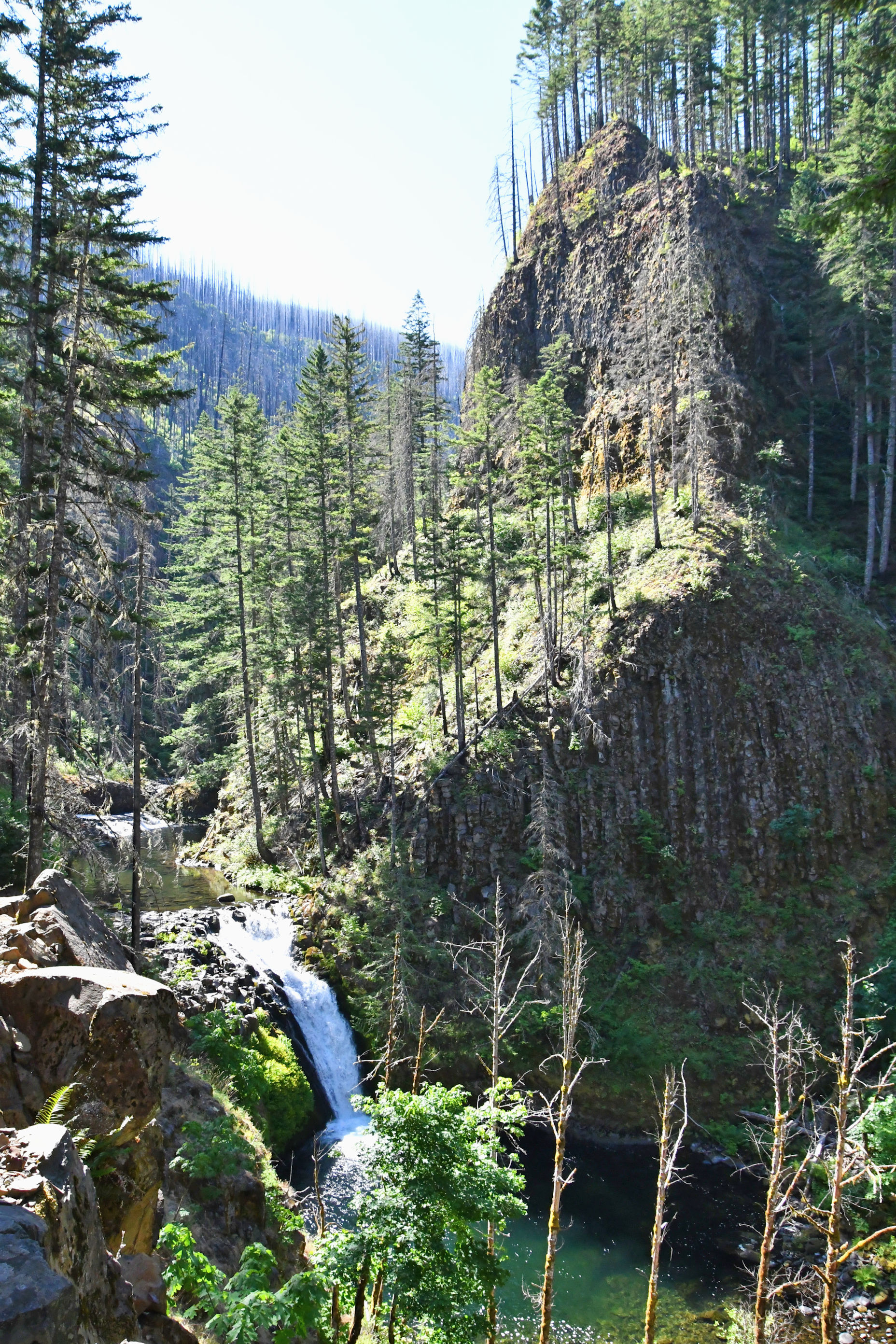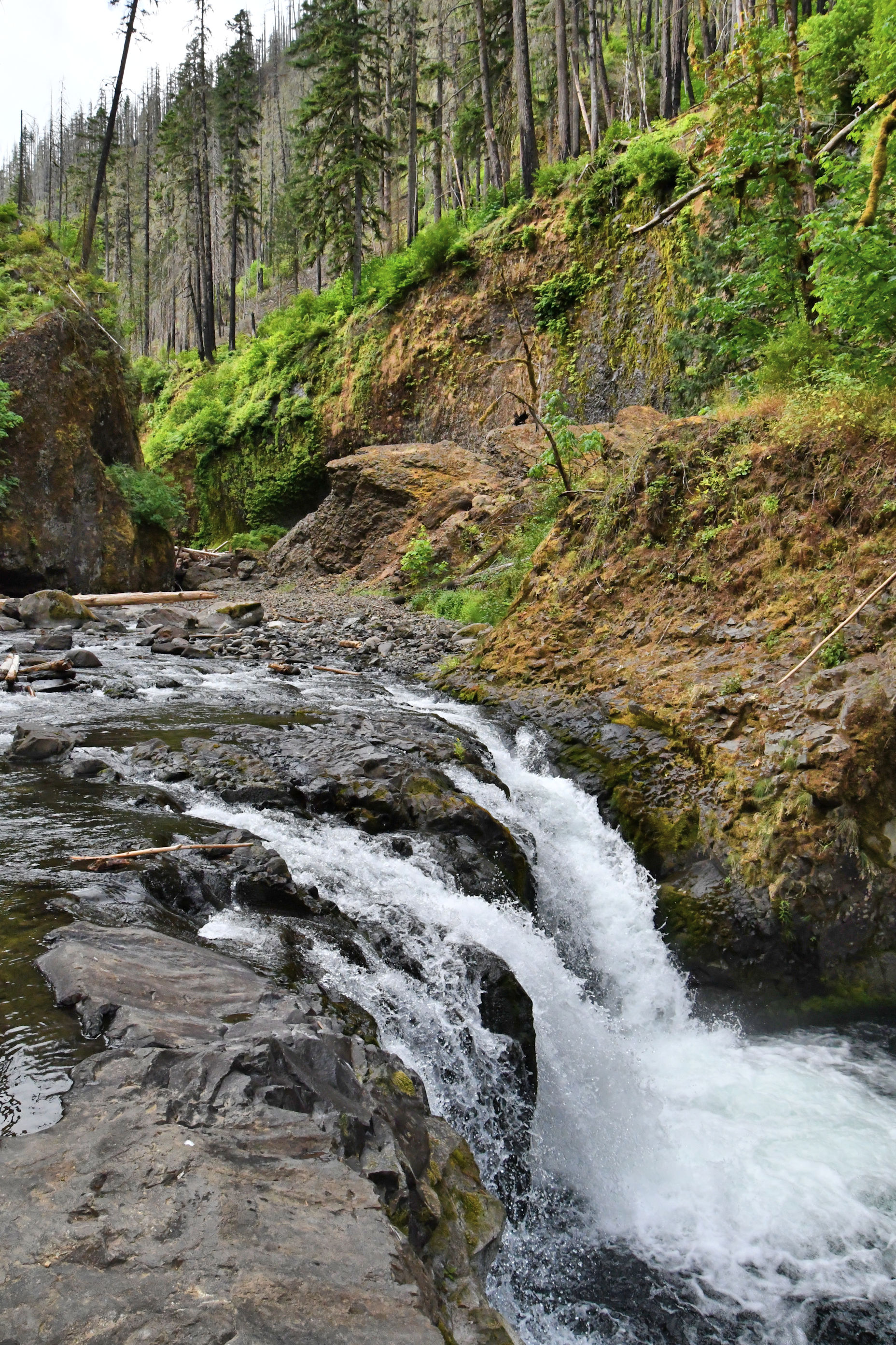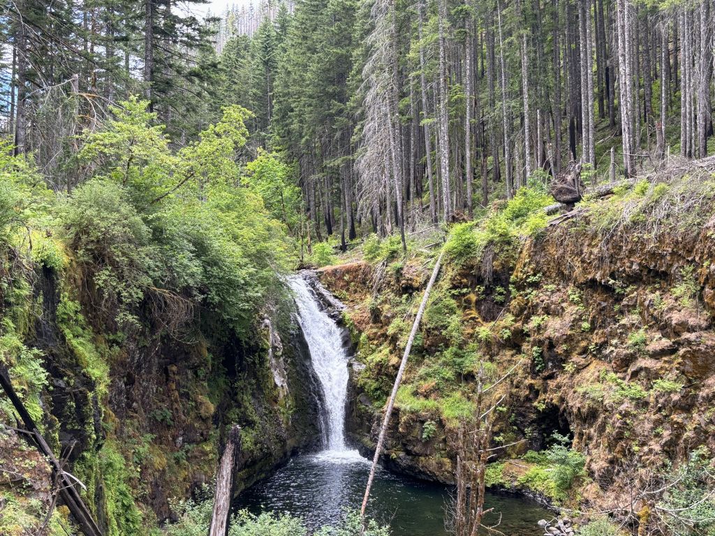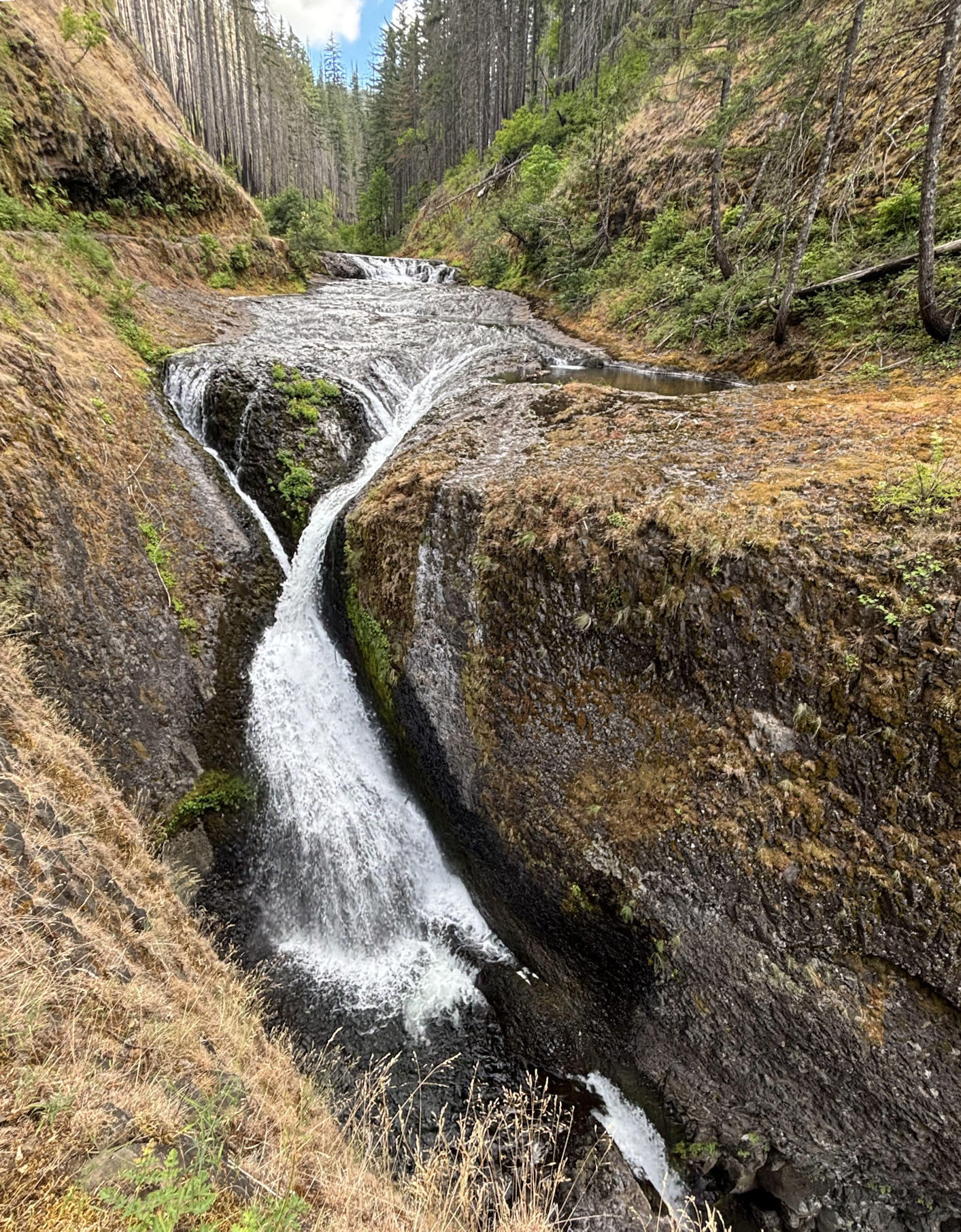 The falls above are along the trail, mostly considered unremarkable, but that is because we live in Oregon and these dramatic falls are freaking everywhere. The one on the bottom right is Metlako Falls, which is a stunning waterfall, but these days one cannot get a very good view of it because of new growth of brush after the fire that didn’t use to be here. In a post from 2015, I have a great photo of Metlako Falls (also you can see what the trail looks like before the fire).