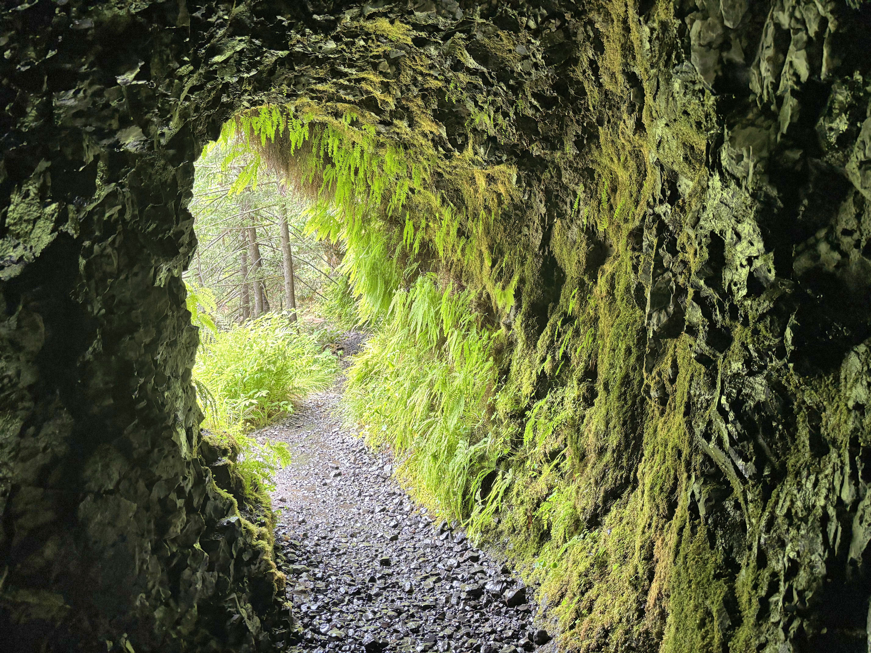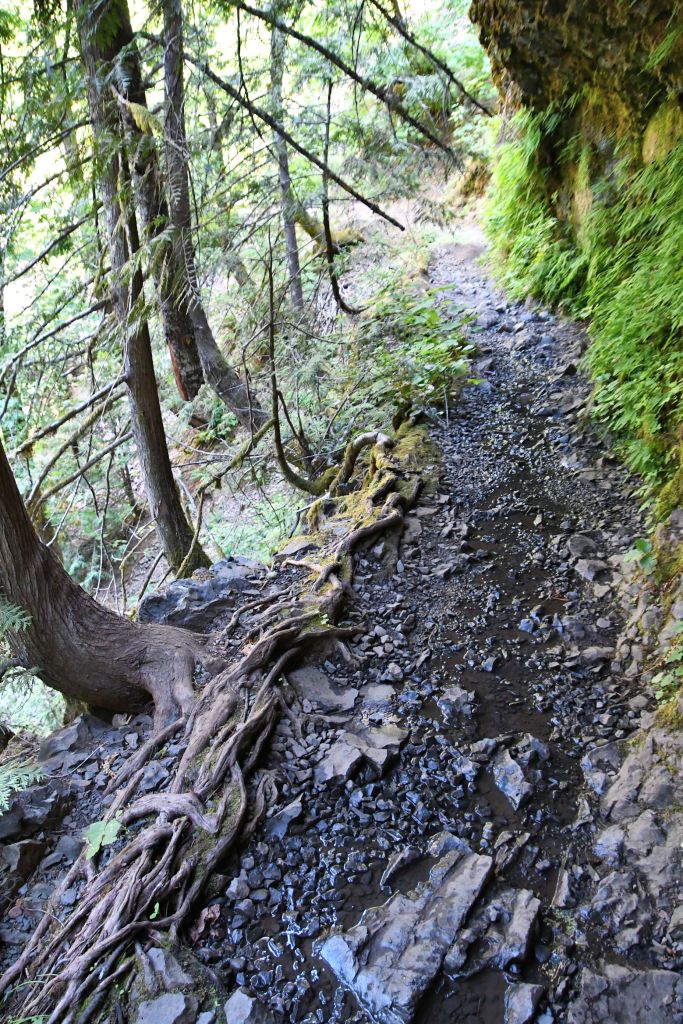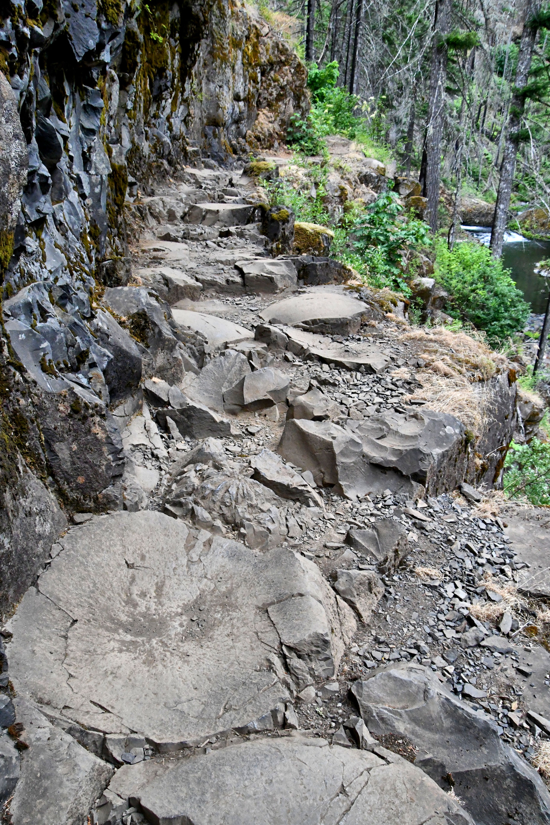 At about 6 miles in, I came to a new part of the trail that is beautiful and interesting, and it’s also beside another photogenic waterfall. This section of the trail intersects giant basalt columns, and their concave and convex surfaces inside hexagonal outlines makes it feel otherworldly.