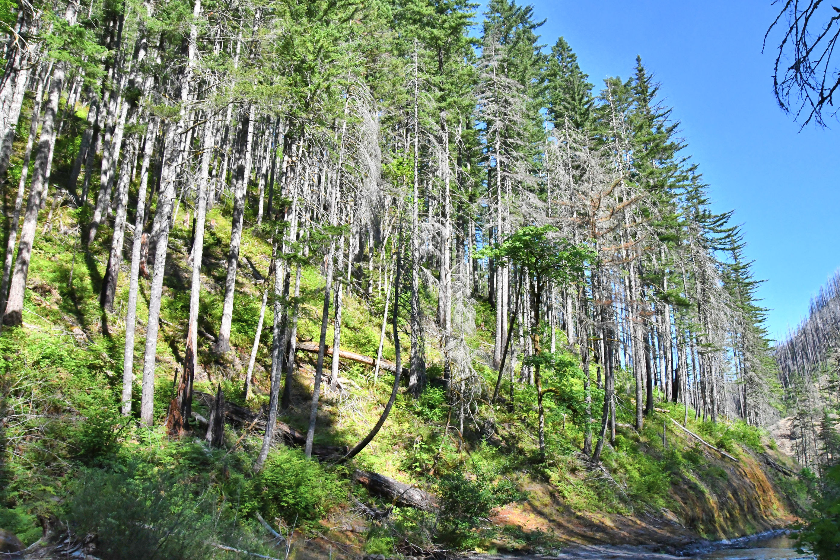 You can see that in places, there are trees that survived the fire, because they are green again in the tops.