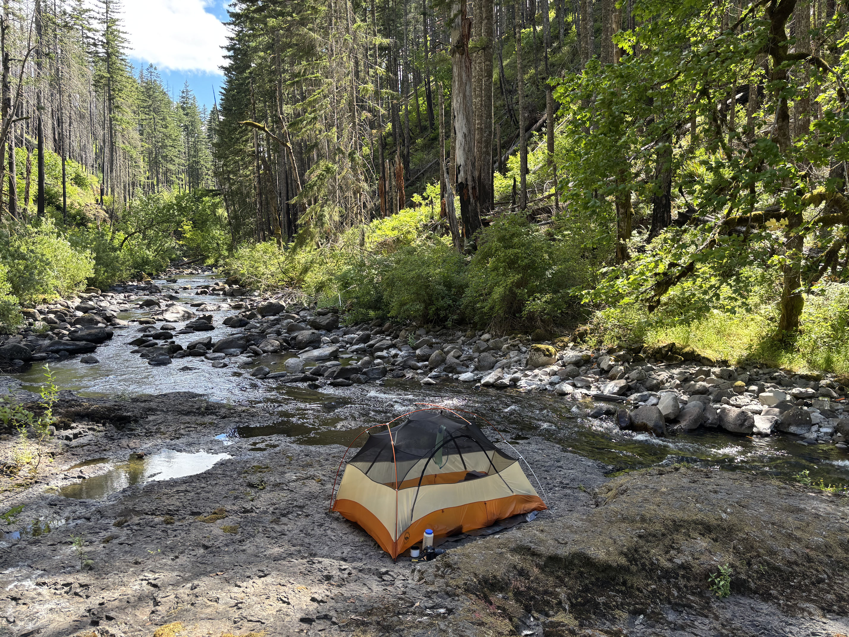 The campsite was fine, just fine. But I really wanted to find a way to stay at the swimming pools. The only place I had seen to set up my tent was on the basalt rocks beside the river, and the jutting rocks seemed sharp enough to damage my inflatable mattress. But at the campsite I found someone’s discarded wool blanket. That solved my problem. I carried the blanket back to the swimming area, and laid it out across the rocks. I laid my moisture barrier next, and set up my tent on top. The rocks were still jutting up, just not sharply enough to damage my equipment. After I put the mattress on top of that, I had a very comfortable bed in the best spot.