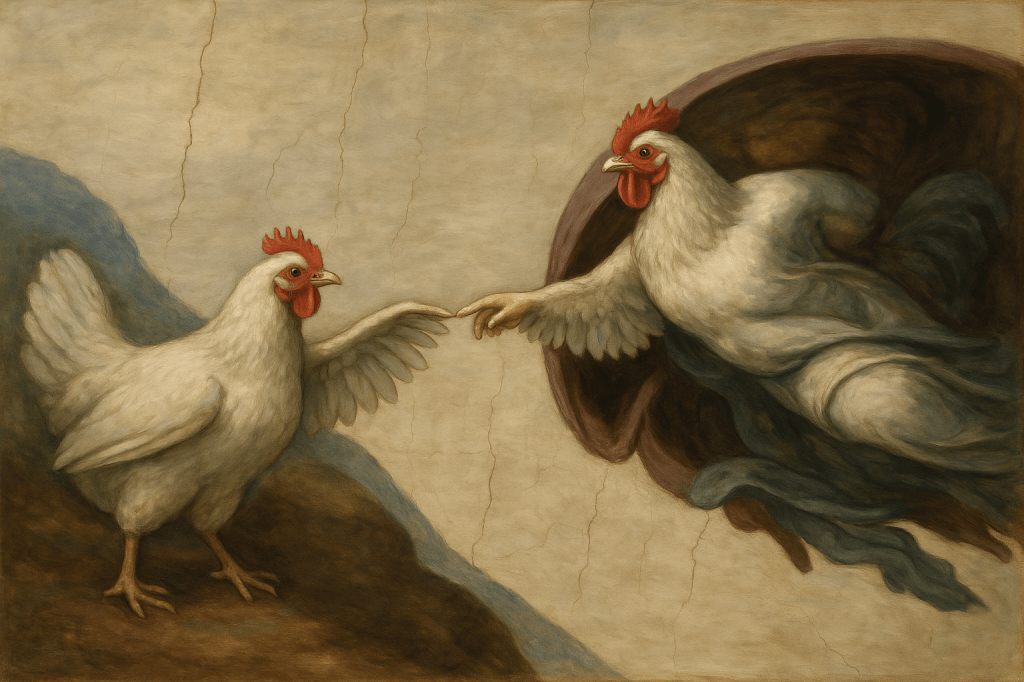 I have to tell you another funny idea we had. See how the ceiling shape of the chicken house kind of looks like a church in the image above? Especially with the white paint. Well, we thought it would be funny to paint the Cistine Chapel image of Adam reaching for the hand of God. But great fun to make them chickens instead. I do not have the talent to create this image, so I asked Chat GPT to draw it for me: