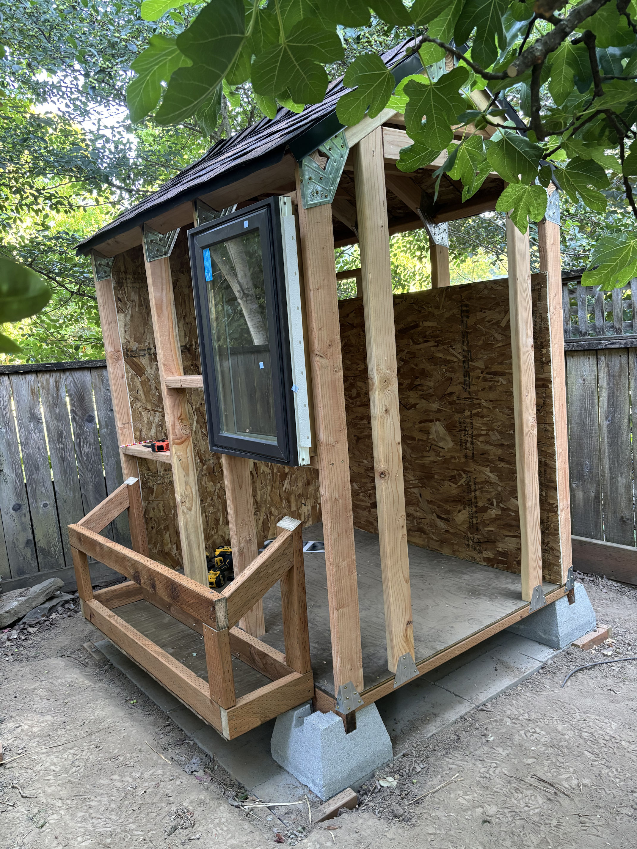 His work on the house is mostly done and I’m up next. I plan to paint the whole thing. I found some barn red paint at ReStore, and I have white trim paint left over from my back yard office. So I’ll paint it red and white like a barn, which seems so cute.