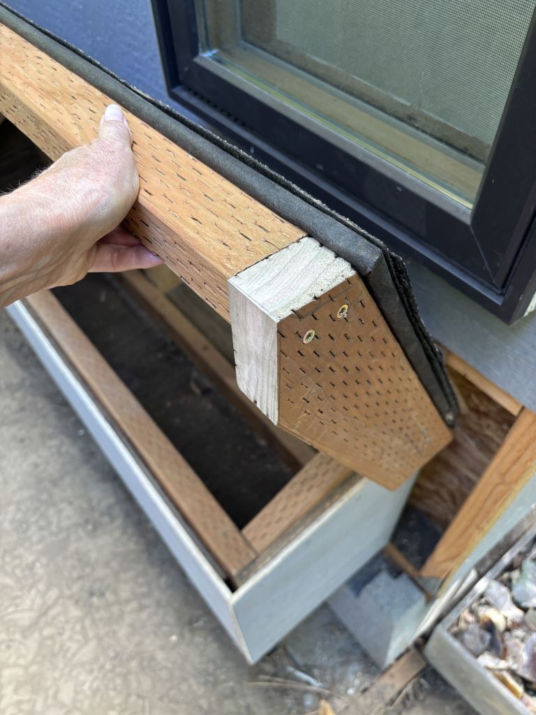 At the corners and joints on the outside, I added more foam insulation and wood filler. Then he attached trim boards all around. Today I will probably head back to ReStore to look for a rubber piece to install over the nest box lid, so that rainwater will not fall into the crack at the hinges.