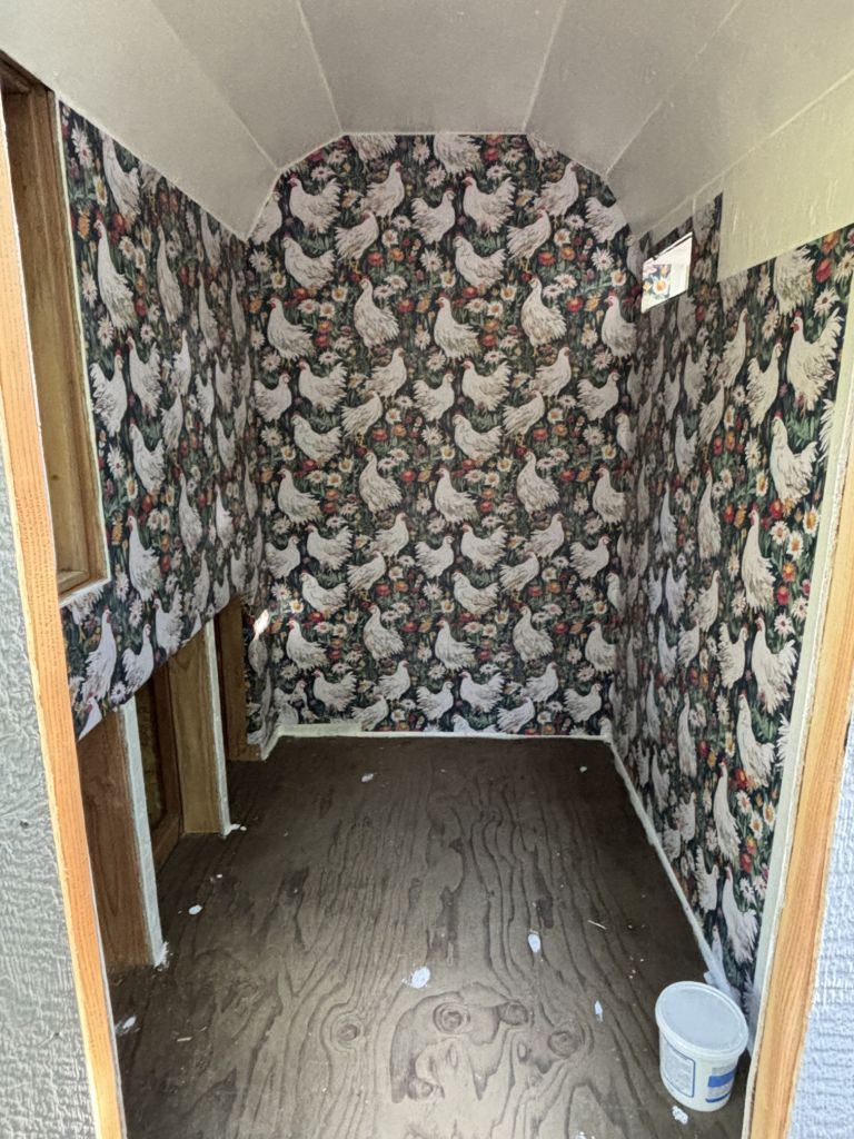 Chicken palace is right. I’m trying to think of a good way to get that ceiling up. I researched custom contact paper, and it would be $60 just for one sheet of it. So I’m thinking of printing it onto poster paper, and gluing it up like wallpaper. It will be protected on the ceiling from the hens’ curiosity.