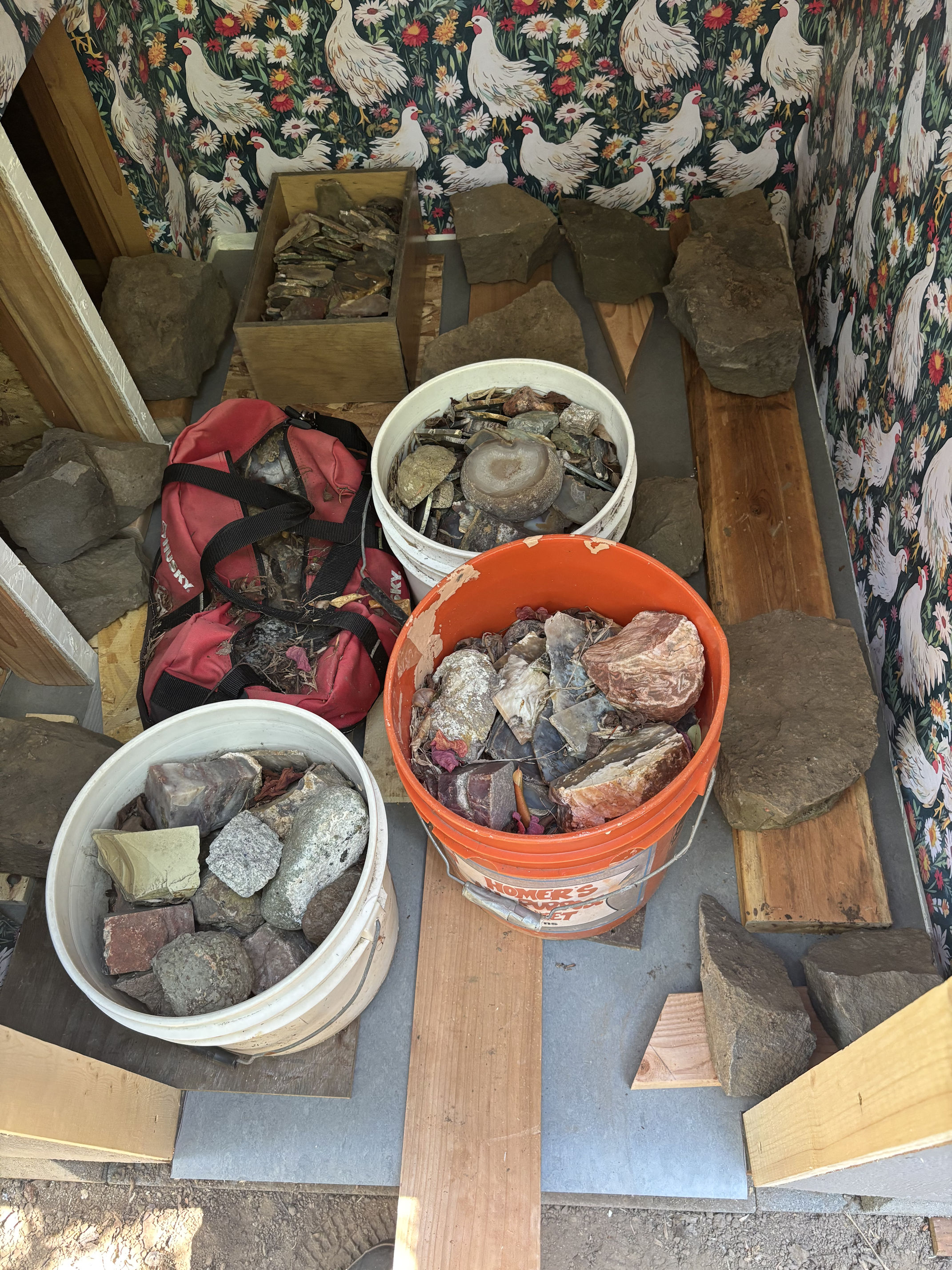 I bought a piece of linoleum from ReStore for $6 that had two little cracks in it but was the exact perfect size. I cut it to fit and glued it down, but it was too stiff to lay flat, and had bubbles and ripples in it. Lucky for us, we have Kellen, who is a rock enthusiast, and has buckets of interesting rocks taking up space on the property. I put down boards to protect the linoleum, then put buckets, a box, and a bag of rocks to weigh it all down.
