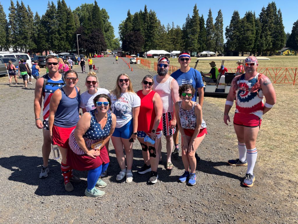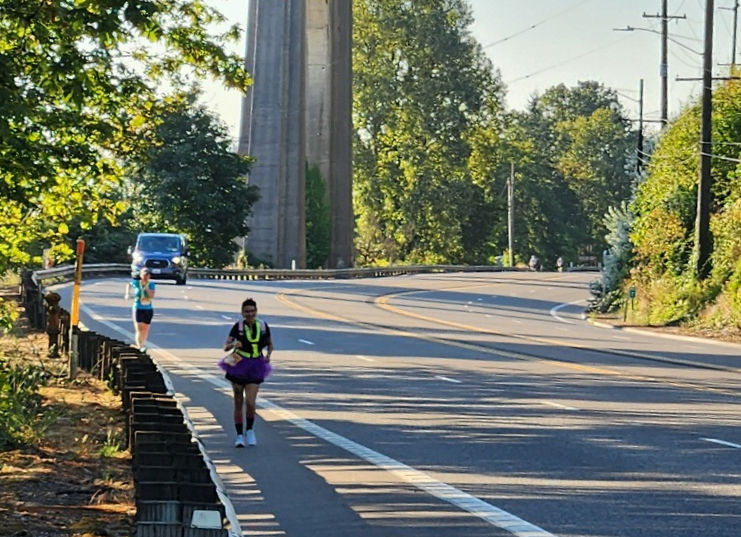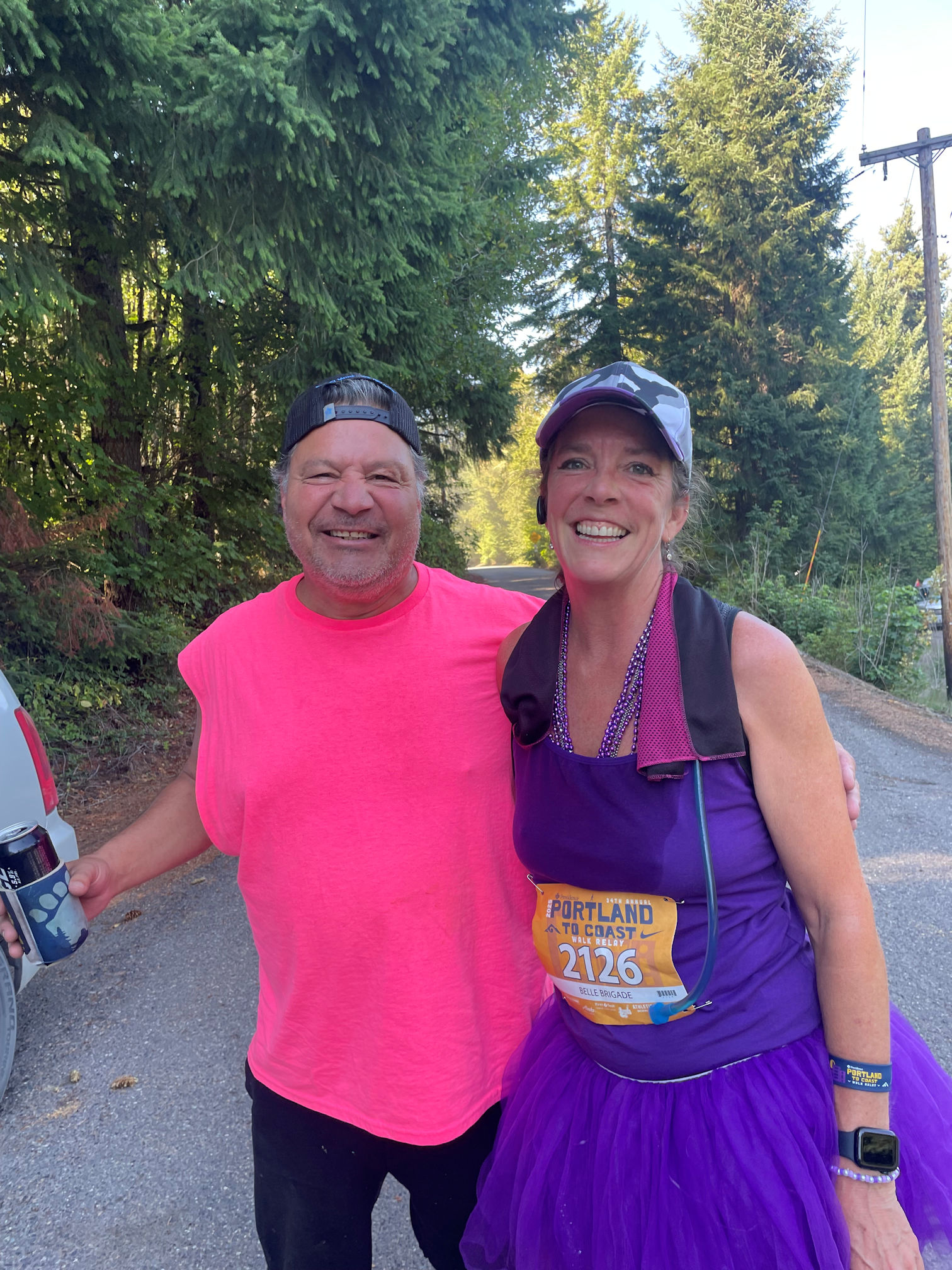 Ours is a 120-mile relay speed-walking race from downtown Portland, Oregon, to Seaside, Oregon. So it’s called Portland To Coast. The course winds through the streets of Portland, then along the highway until it cuts off and dives into the very rural mountain towns and roads in the middle of nowhere. Simultaneously, there is a running race from Timberline Lodge on the slopes of Mt. Hood, through the city of Portland, to Seaside, Oregon. It’s more famous, and is nearly 200 miles, and is called Hood to Coast. Walkers and runners race at the same time. Teams are typically 12 members, and we take turns racing on prescribed legs that are mapped out by race organizers. These are 4- to 8-mile sections that we take over from another teammate, then go as fast as we can, until we hand off to another teammate.