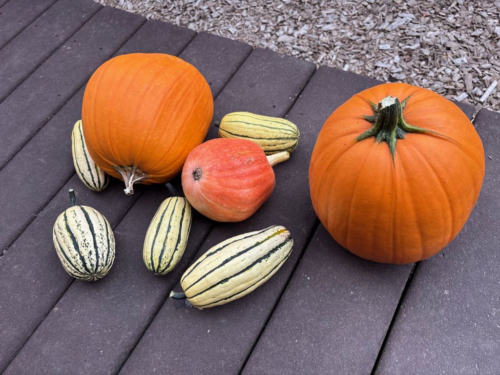 We are spotting different birds. The garden scenes are shifting. The sunflowers and dahlias are drooping. The harvest is different. When at first we were inundated with peas and lettuce and chard, and so many cucumbers and zuchinni. Now we have peppers and pumpkins and delicata. Our tomatillos are all ready, the string beans have proliferated, the potatoes are big enough to eat.