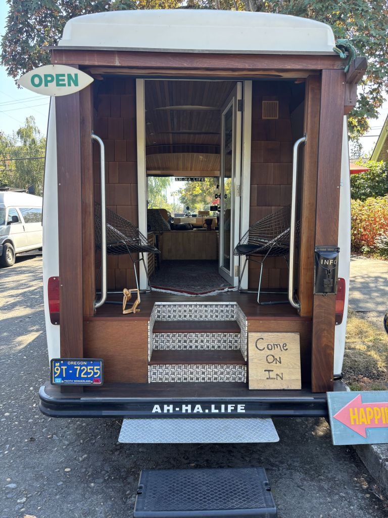Pedro and I went for a walk this weekend after the Cherokee meeting. As we neared the Alberta District, we passed this tiny trailer parked on the street and made into an art exhibit of sorts. A sign identifies it as the Imaginarium. Luckily a cyclist with spouse and kids were also there, and he explained to us that the owner of the camper makes it available to anyone to walk in and look around. Pens and paper are provided to write notes. Visitors are encouraged to sit and stay, and we witnessed a woman climbing to the top to sit on the patio on top of the van, with a stuffed Winnie the Pooh bear under the umbrella.
