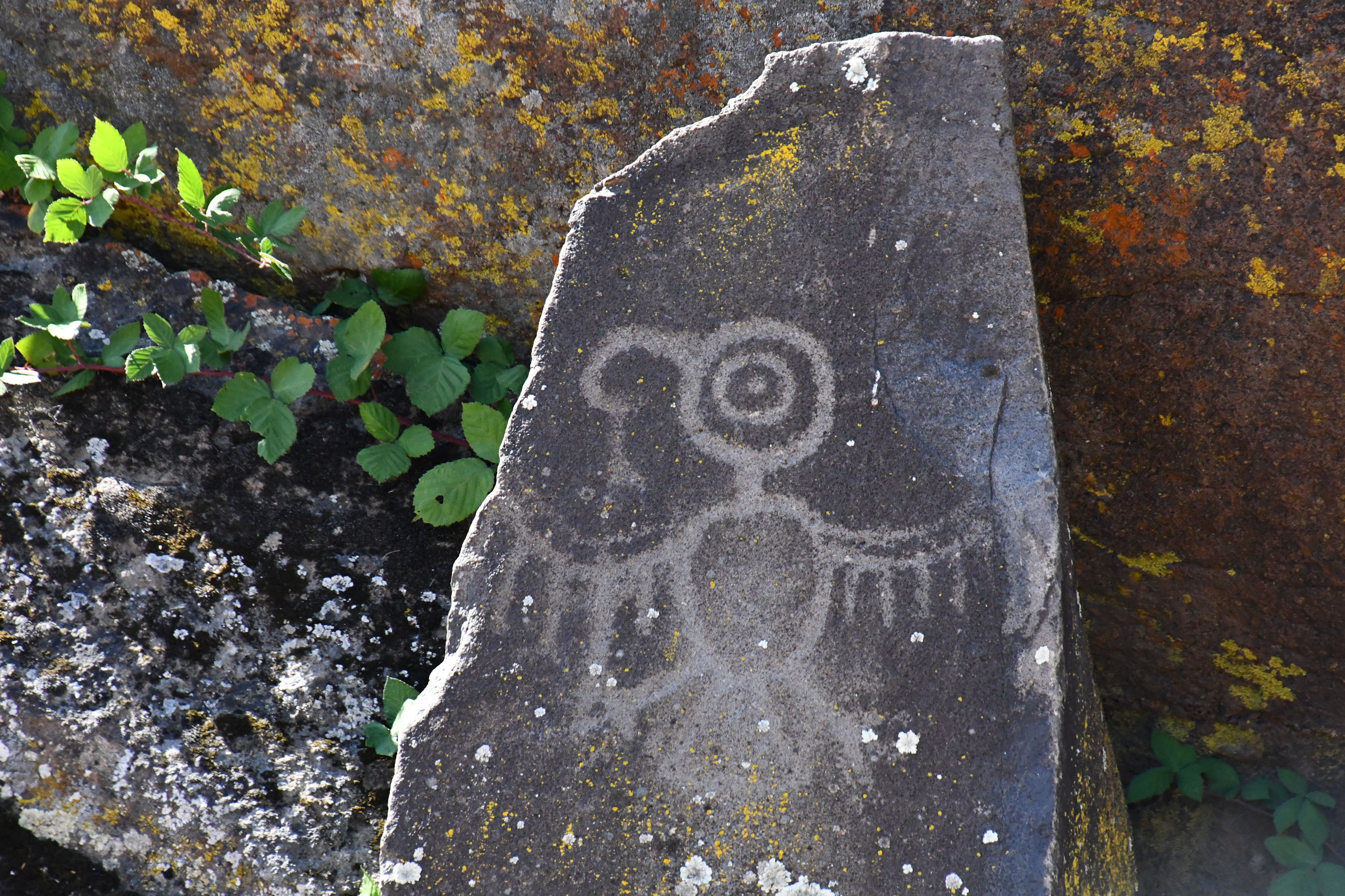 There is a short hike (less than one mile) to Tsagaglalal. Our group of Cherokees carefully picked our way between boulders and made sure to stay on the trail. All the images on stone along the trail are pictographs, or images created by applying pigment to stone. The images from our hike last April are much better because the sky was more accommodating. Please click the link if you want to see it all more clearly.