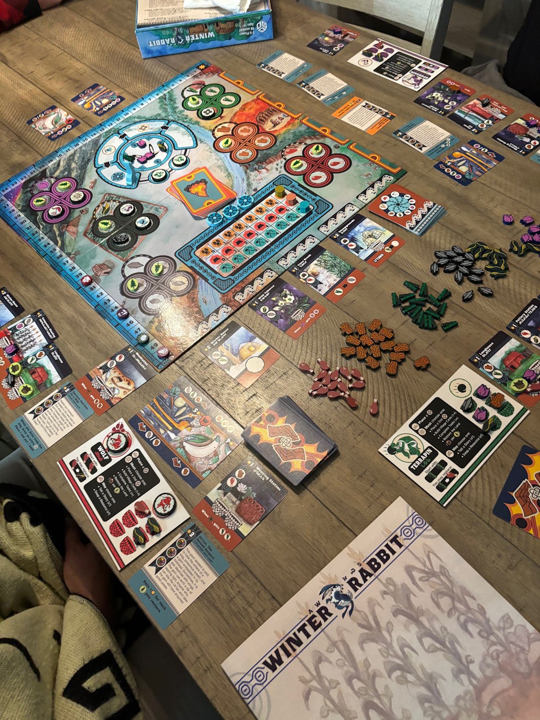 What Pedro likes to explain about the game Winter Rabbit, is that it is a cooperative game. The goal is to get the village ready for Winter. Villagers are Otter, Wolf, Terrapin, Bear, and Opossum. Unlike other games, the only way to win is if the village first gets enough supplies for Winter. If you don’t help the others, you can’t use your score to win. Many of the tasks you do are filling other villagers’ needs and not your own, and during play, almost every time you get something, someone else also gets something. It is also resource-conscious. When you need to cut trees to get more resources, the space is a disadvantage until you replant the forest. There is a sneaky Jistu (Rabbit) who tries to steal your winter stores.