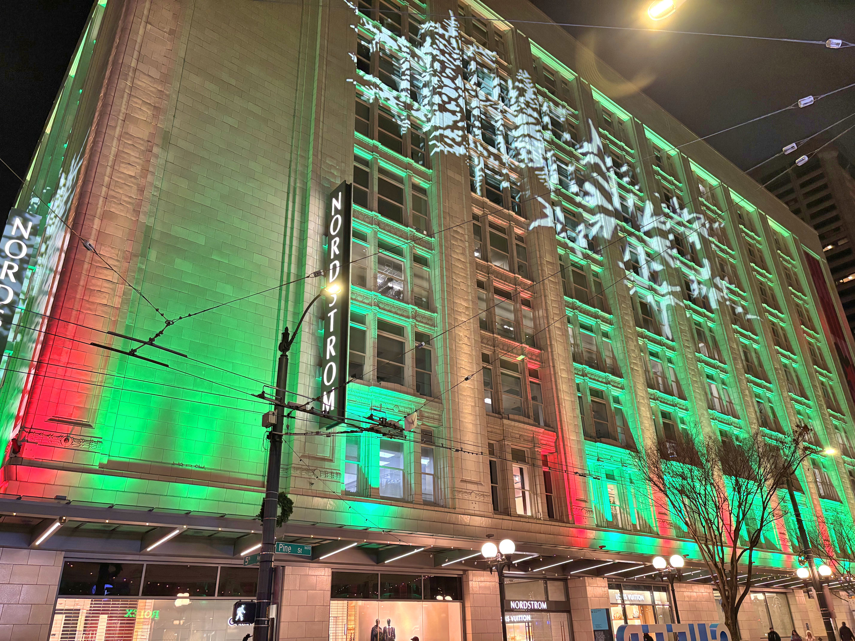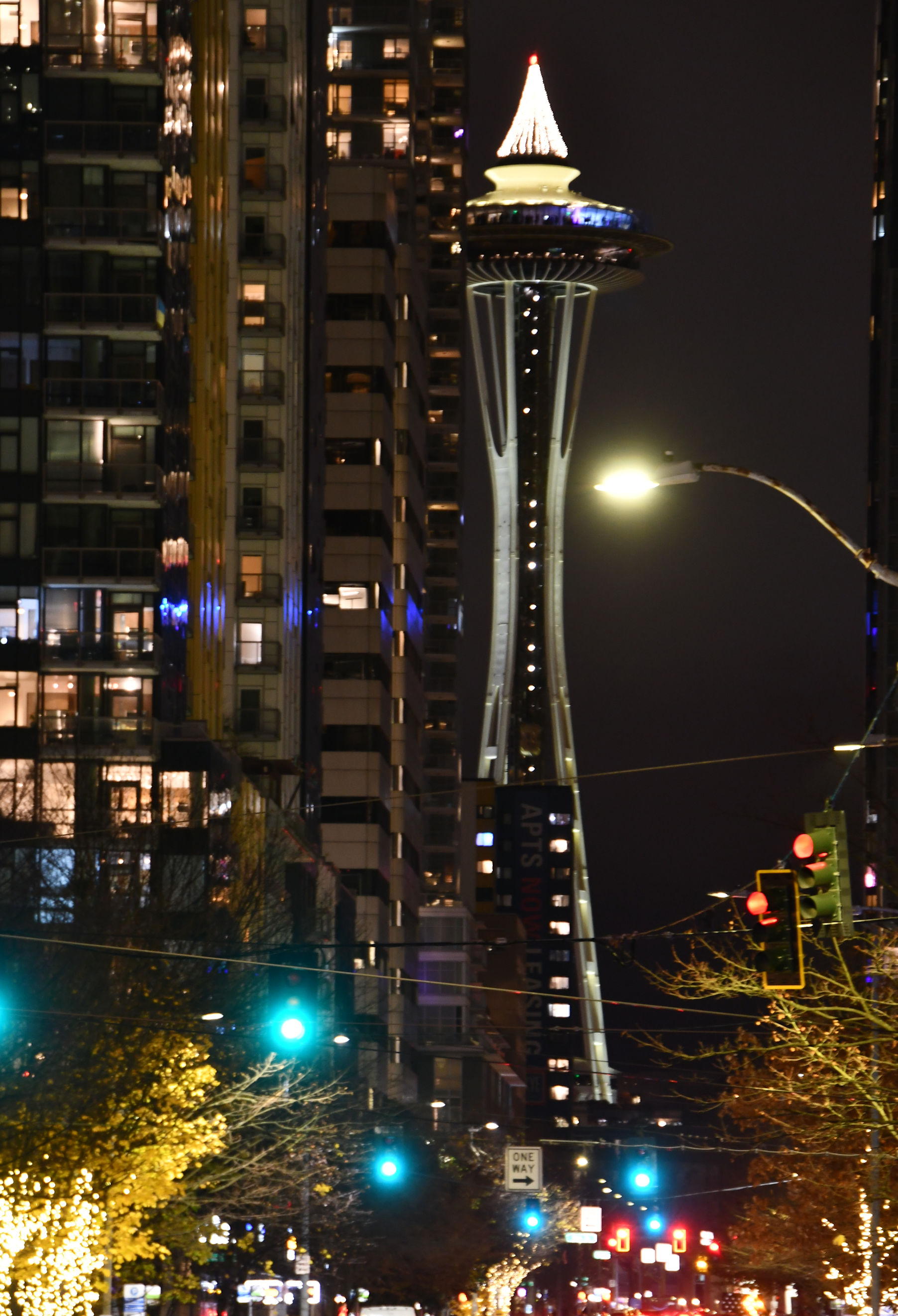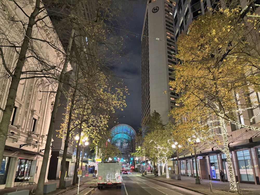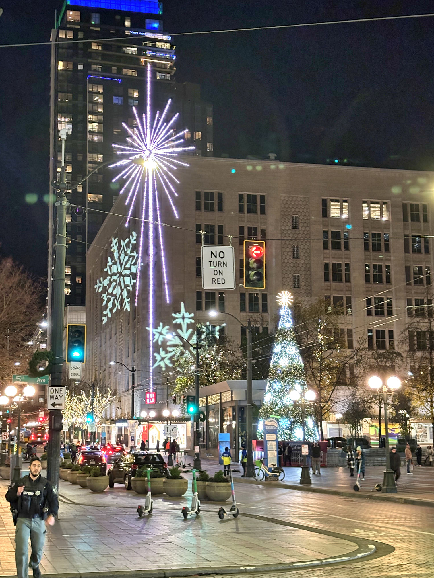 Pike Place Market is always fun, with its multiple underground levels, and the famous fish tossing at the fish market. It was very busy on this dry December weekend, and people at stalls watched us with eager eyes, hoping to tempt us to make a gift purchase. Our hotel was only a short distance, but uphill. The walk felt good after our big meal. I am eternally delighted with lights at night, especially when things are wet and especially reflective.