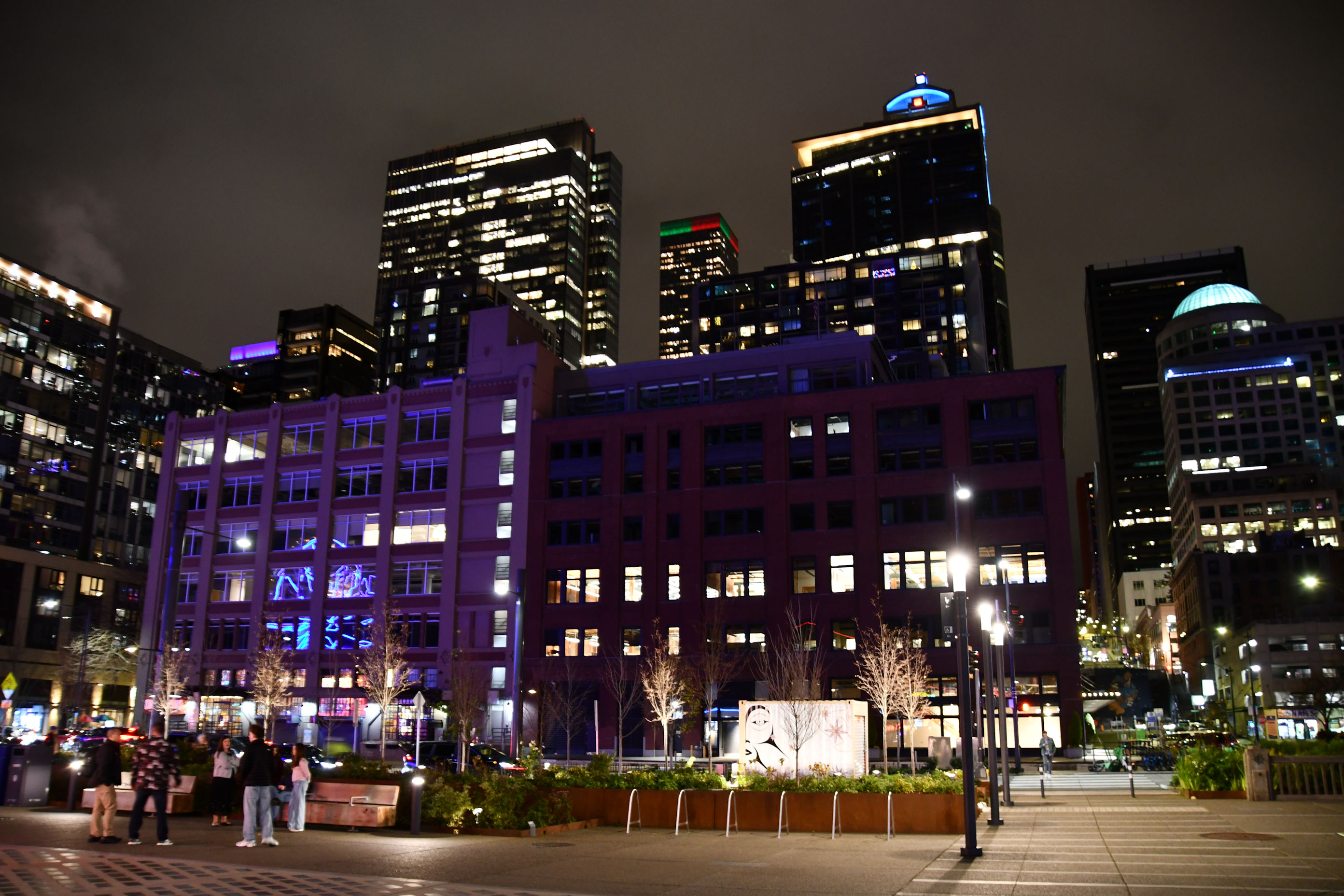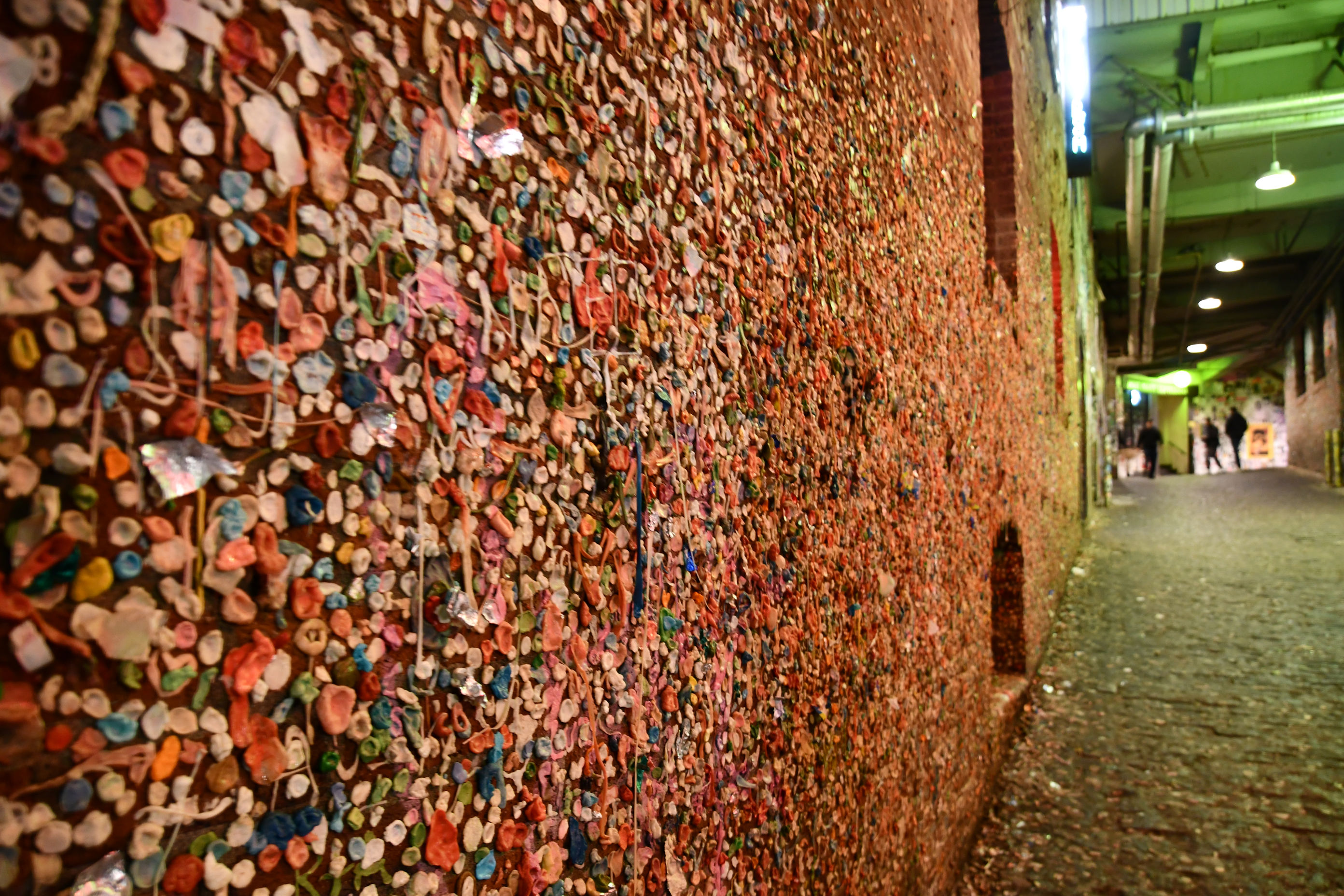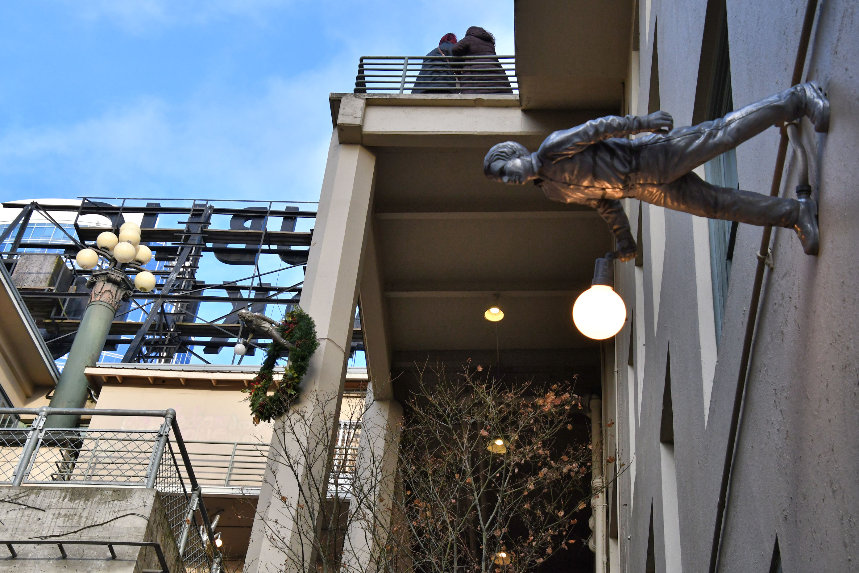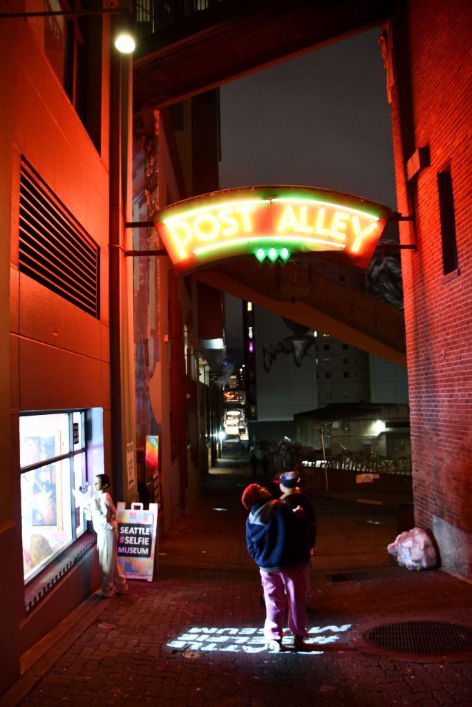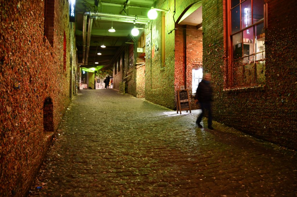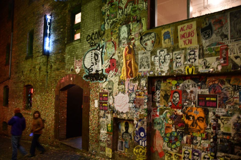 Of course it was pitch black by the time we headed back to our room. We explored a bit of the city and enjoyed Christmas lights and people all around. Pedro wanted to swing through the Pike Place Market. Neither of us wanted to go to the so-called Gum Alley, but we ended up there anyway, as we tried to find our way.