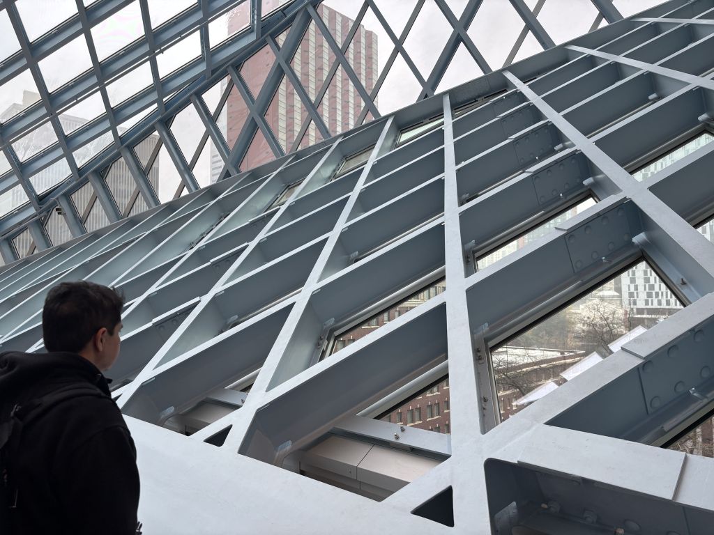 One building seemed especially familiar to me because of an architecture tour my brother Ian took me on once, when he lived here. We had tried to visit the library, but it was closed that day. I told Pedro I thought the building might be the library, and we crossed the street to investigate. It was the public library and it was open! We went inside and explored the space.