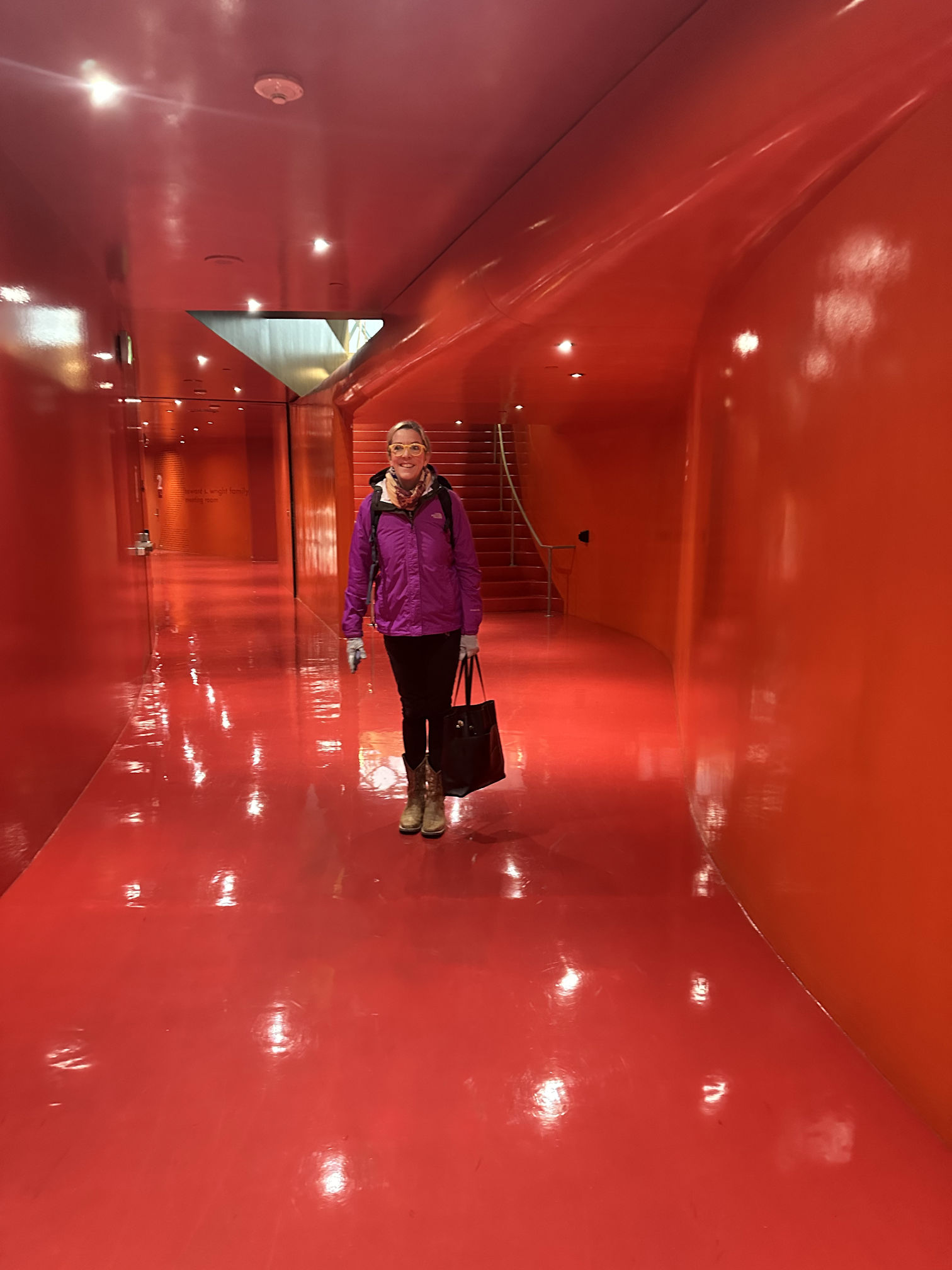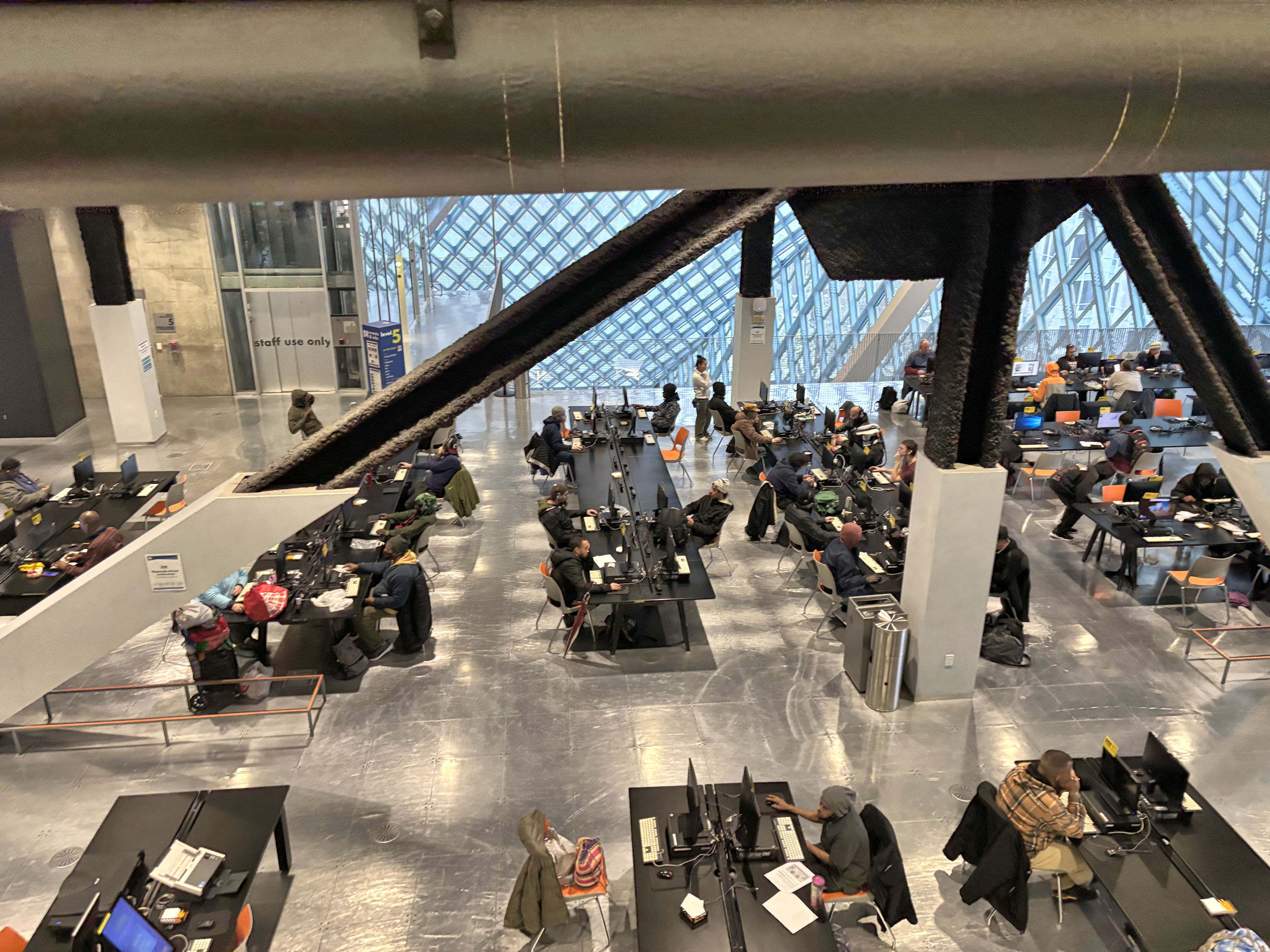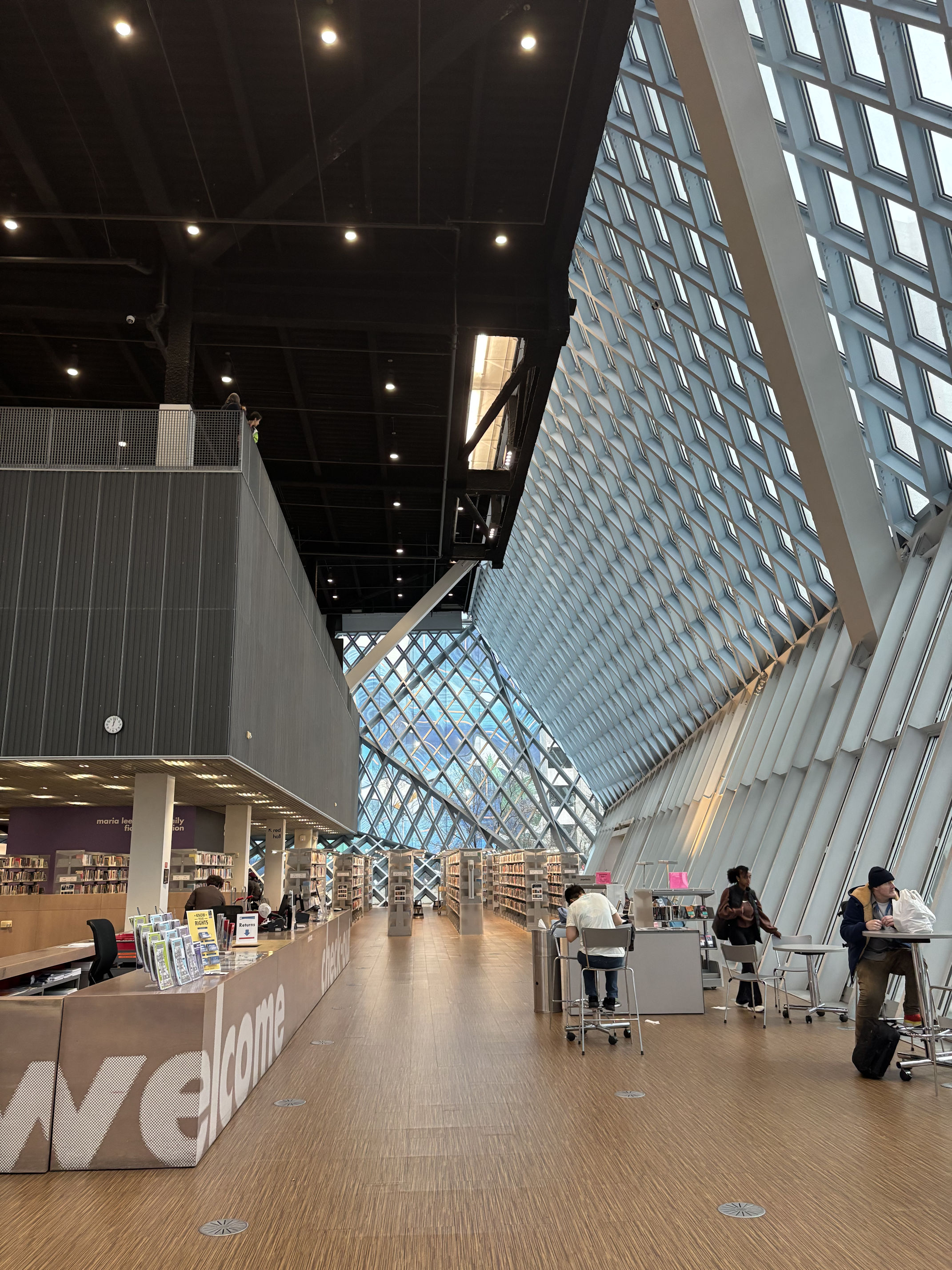 One building seemed especially familiar to me because of an architecture tour my brother Ian took me on once, when he lived here. We had tried to visit the library, but it was closed that day. I told Pedro I thought the building might be the library, and we crossed the street to investigate. It was the public library and it was open! We went inside and explored the space.