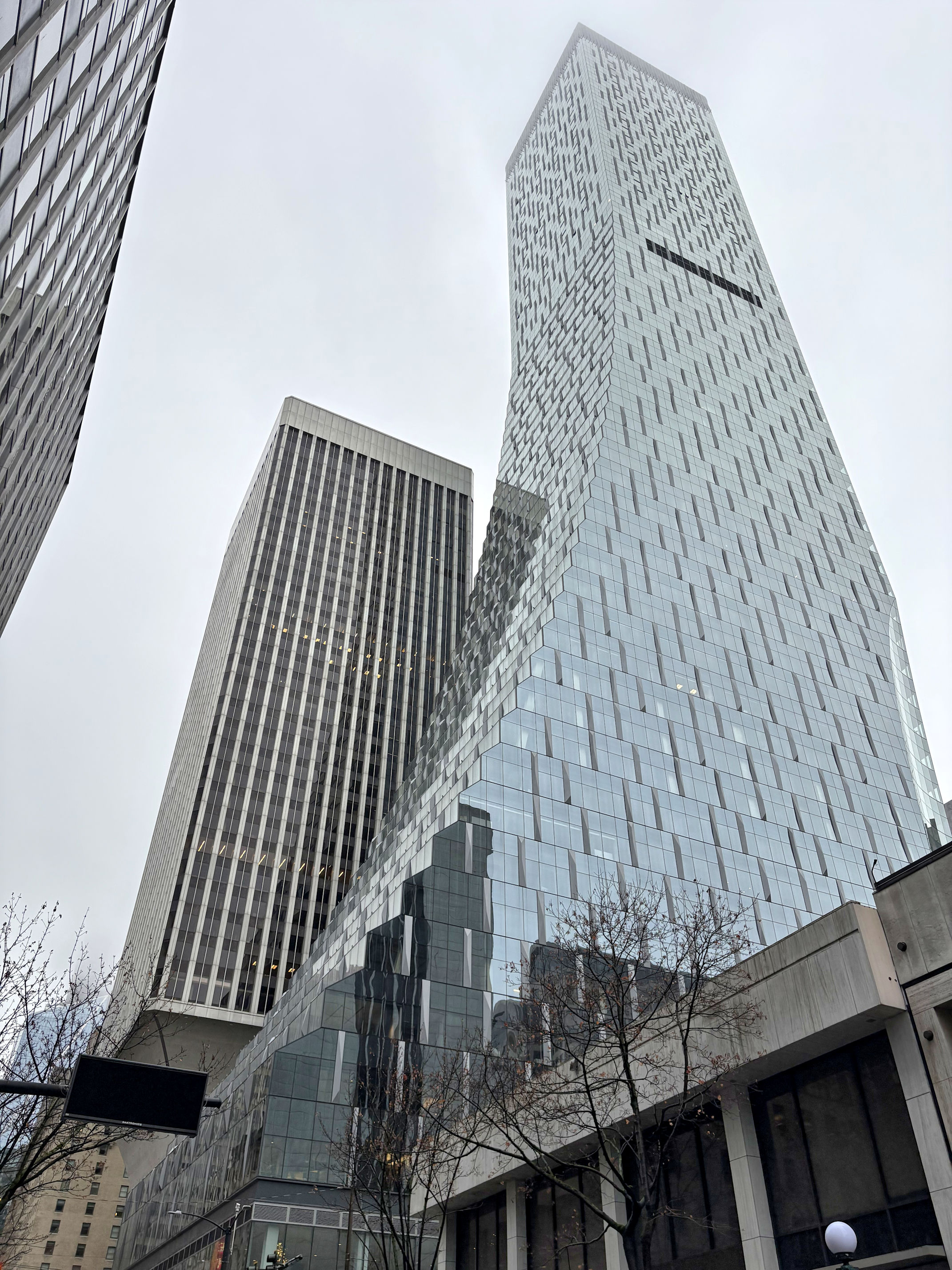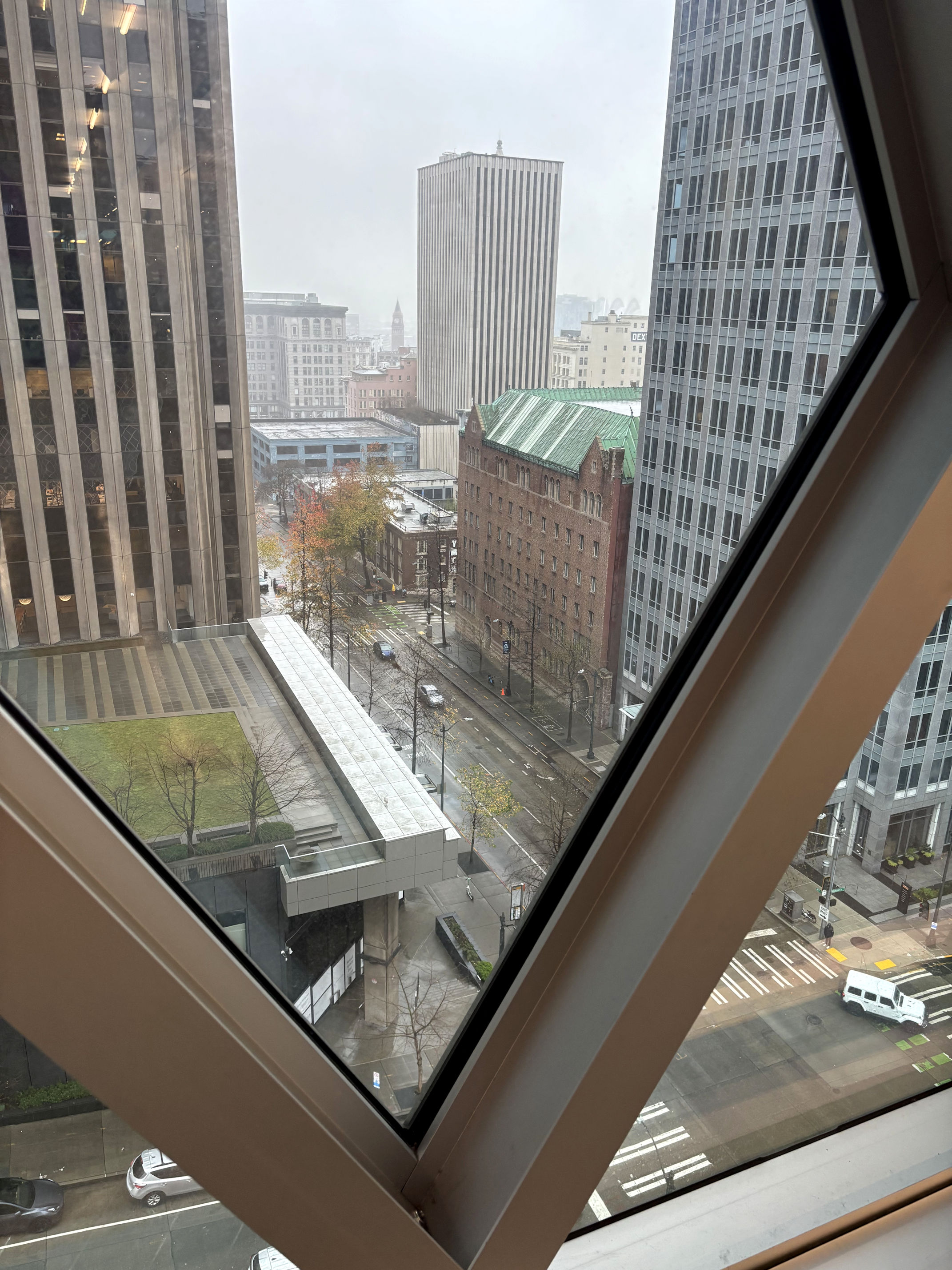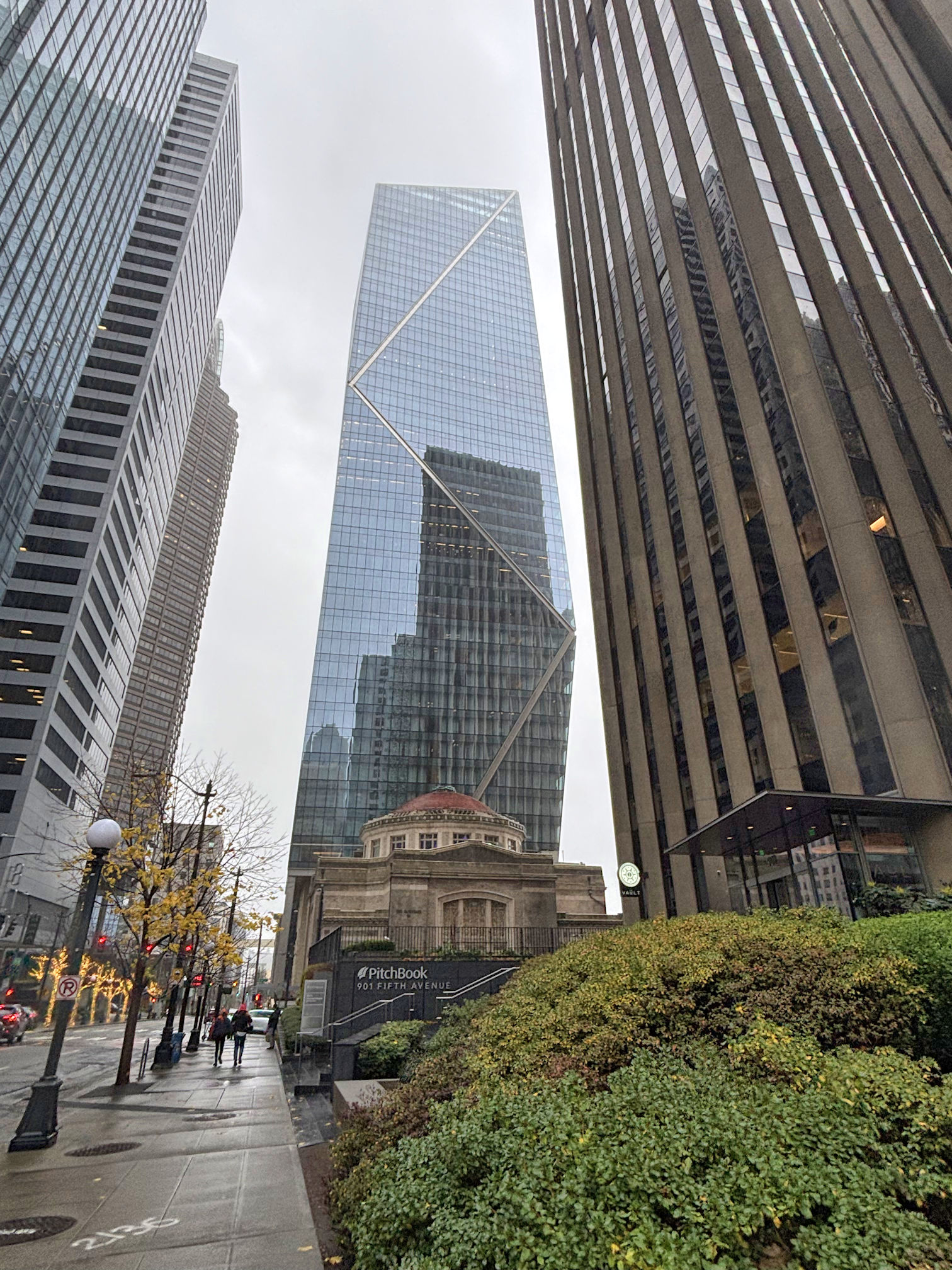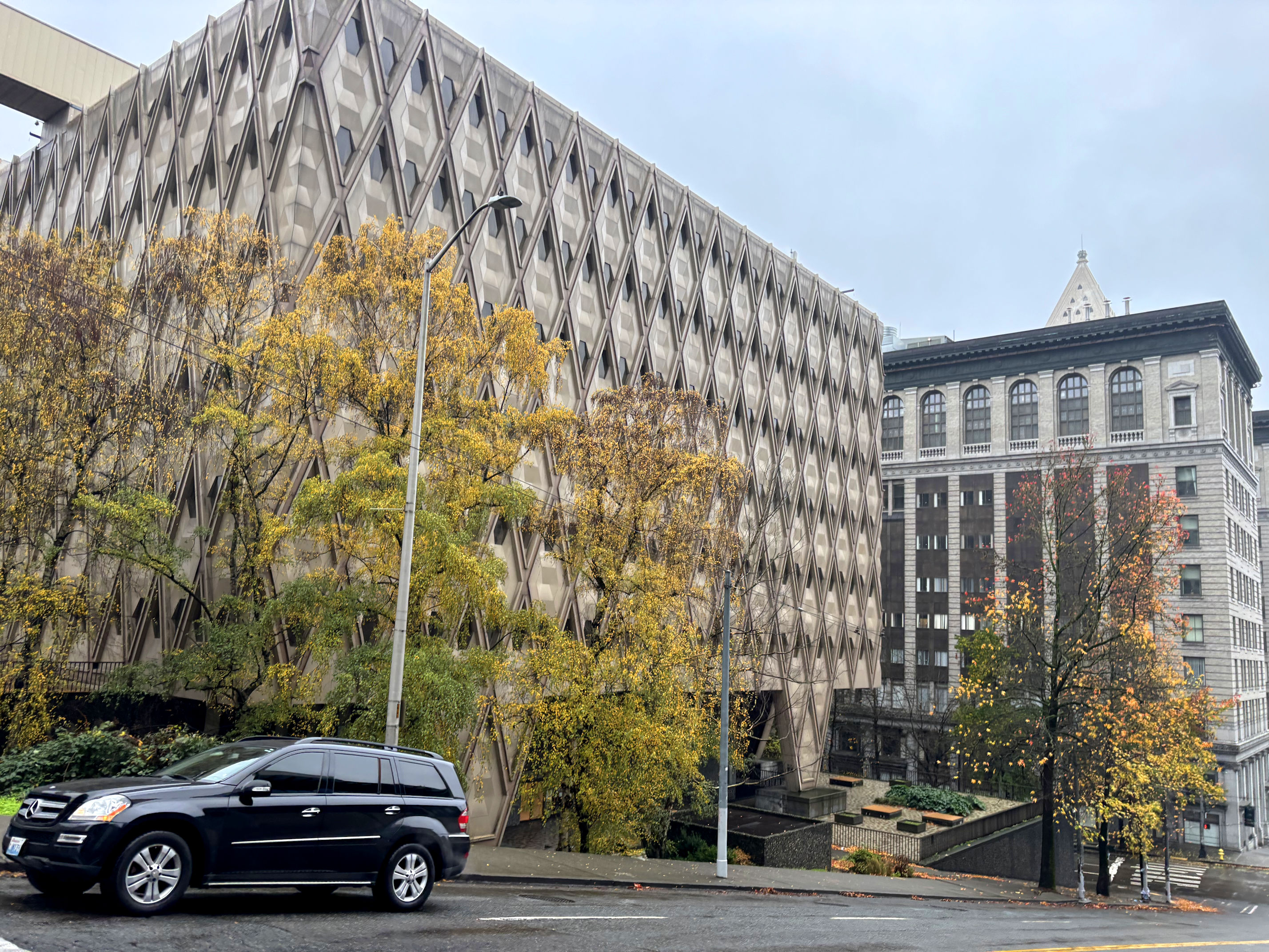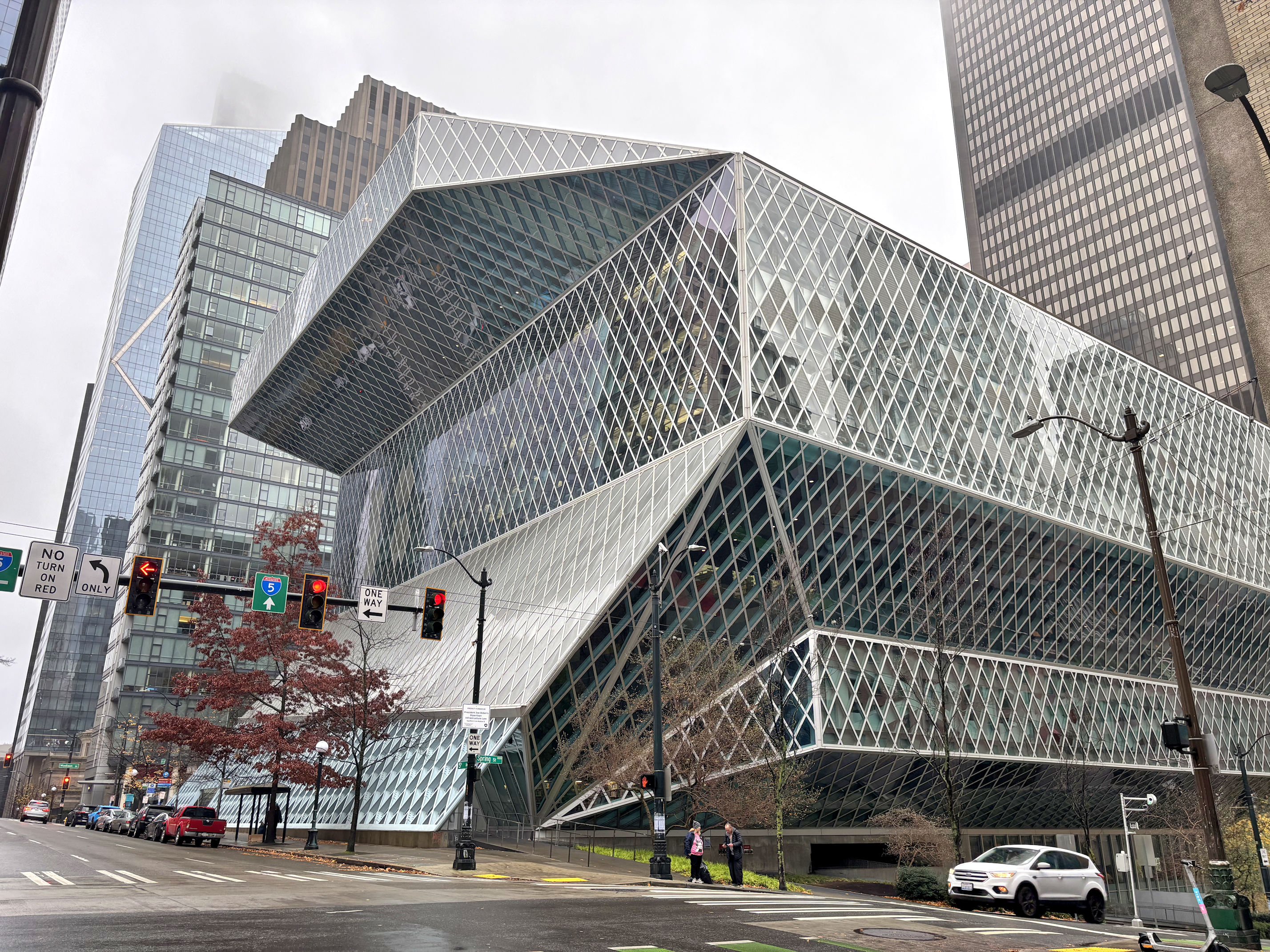 The most interesting thing along the way was architecture. What fascinating, wonderful structures can be found in Seattle. It was raining again, with very low clouds, and the grey wet day under fabulous architecture reminded me of the one day I spent in Vancouver, BC in similar weather with similar jaw-dropping architecture.