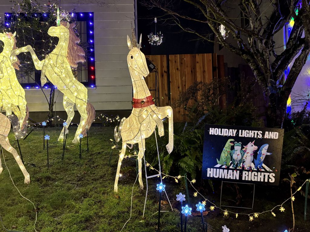 The sign in the photo above was my favourite of the week, because it’s pointed without being too aggressive for a holiday display. It shows four inflatable animals, including the frog dubbed Freedom Frog, that are often seen protesting outside the Immigration Facility (ICE) in Portland where they hold captives ICE has been illegally detaining. These inflatables are famous for being the symbol of pushback against our President Dump calling Portland a hellhole, on fire, and a war zone. Our local citizens dress up as silly animals to protest, with the message being: Either you are afraid of inflatable animals, or it’s safe enough to dress as an inflatable animal with the purpose of mocking authority. Which is it?