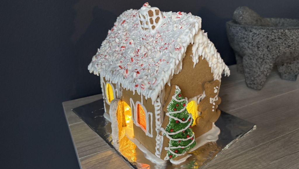 For the first time ever, I tried melting Jolly Rancher candies to make stained glass windows in my gingerbread house. It’s so easy and so beautiful. Who knew? Pedro bought fairy lights small enough to tuck inside, and so this is my little house, warmly lit and so cute with the stained glass windows made of candy.