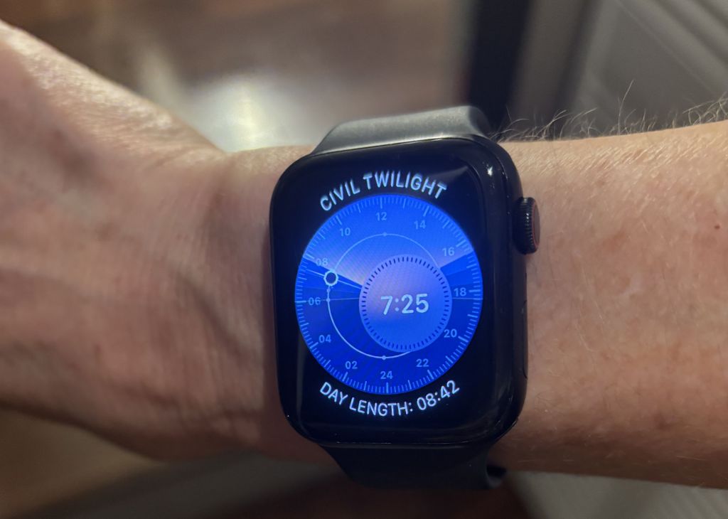 My favourite lights right now are on the watch face of my Apple watch. I like this particular watch face, that shows astronomical information. If I tap the time, it changes the screen for three seconds to show the length of the day. I managed to catch it at the shortest day of the year for us, at 8 hours and 41 minutes, surprisingly, not on December 21, but a couple of days before. If I tap the watch right now, we have already increased to 8 hours and 45 minutes. Each 60 seconds we gain is a victory! Brace yourselves my friends in the northern hemisphere: Spring is on its way!