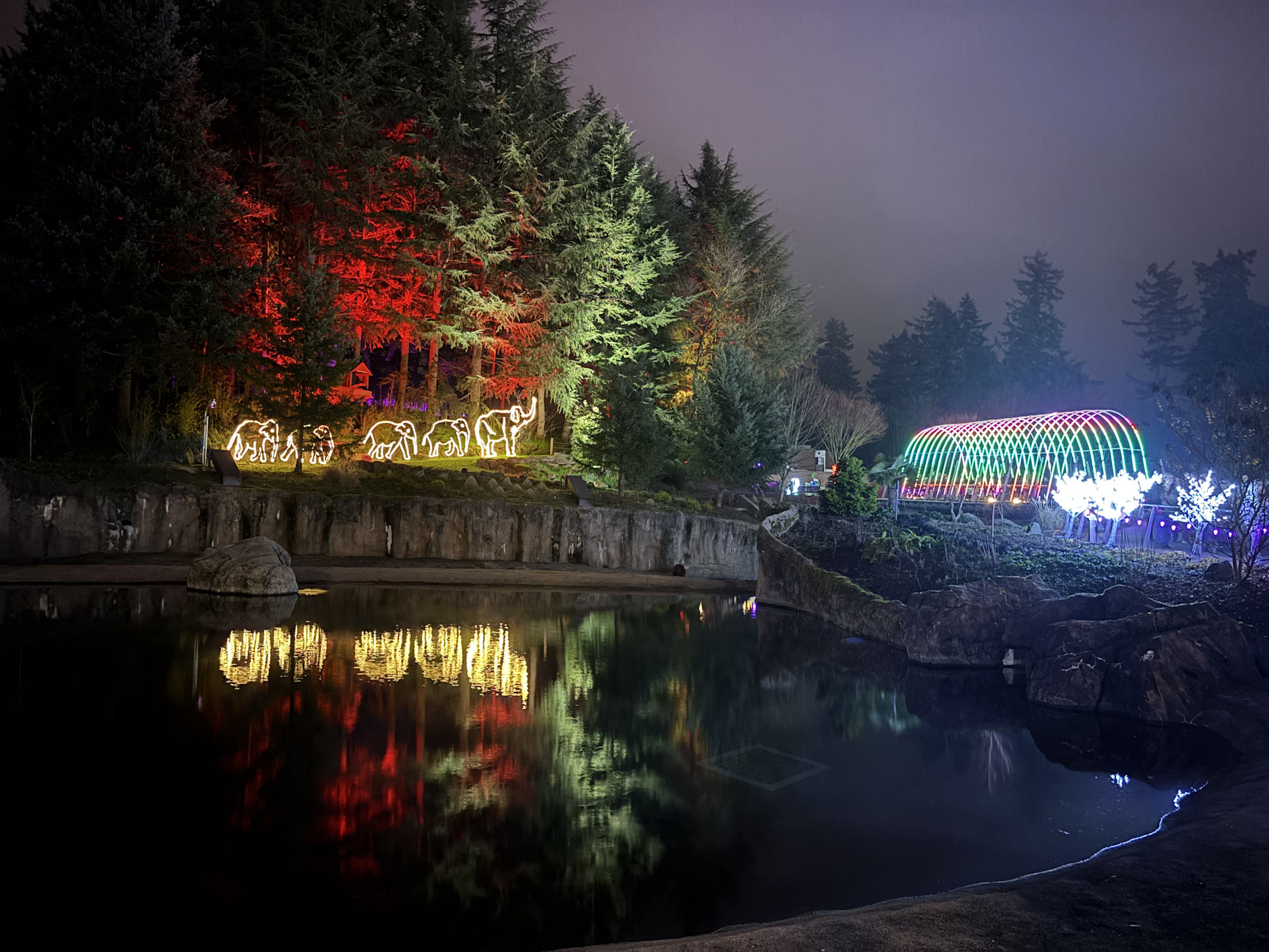 To avoid crowded and costly zoo parking, we parked at the Transit Center and took the MAX train to the zoo stop. Zoo Lights tickets can always be used as MAX tickets, as a way to address congestion.