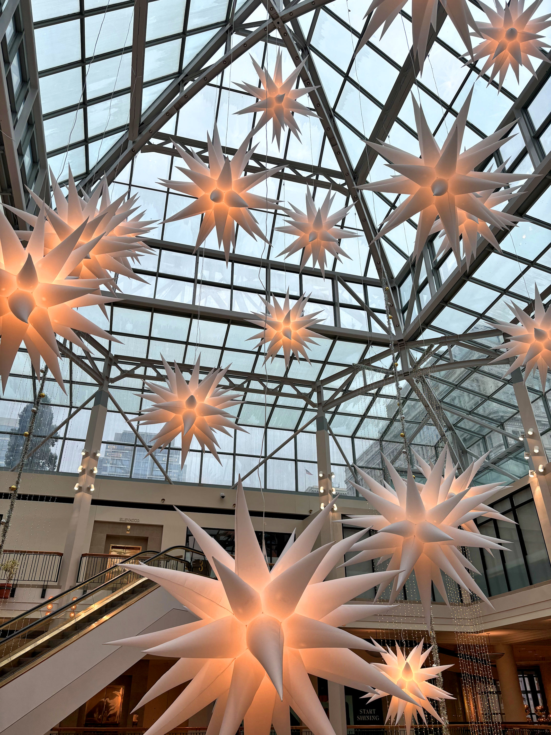 The lights above are at Pioneer Place. The shops there are too fancy for my budget, but I ducked in to escape a downpour a few days before Christmas.