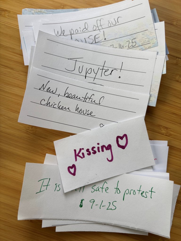 Observations: In both years I mentioned “Pedro trusts me,” and I think that is a gift. I see more doom and gloom than usual in a jar that’s supposed to be filled with good stuff. But for real: 2025 has been very hard on us. And yes, it’s because of the President and the chaos and destruction he manifests on all sides of him. We fear one of us, or a loved one, being disappeared simply for having brown skin, Pedro losing his employer because his company is too “woke,” our kids ostracized for expressing their identity as more than M or F. Passport offices have already changed the gender on renewed passports to match a person’s birth certificate. Pedro’s son Liam is directly affected by this. Dark, poisonous thoughts claw at us all day long, every single day. It’s making work and school stressful. Here in the Portland area, we have organized community groups to surround day care and school facilities to fight off ICE when parents come to drop off or pick up their kids. And it’s not just adults: in November one of those kids was kidnapped by ICE when he left school grounds at lunchtime. Makes no difference if the people are here legally, or even citizens, because masked, unidentified, armed strangers grab people off streets and only ask questions later if the public causes an uproar. The administration has a plan to review all naturalized citizens and begin revoking citizenship for anyone they don’t like. Fear hovers at the edge of our psyche daily, which is not unique in the world, but a new thing in the U.S. Anxiety and suspicion makes it hard to be with others. One of my personal friendship groups has broken apart. And yes, my relationship is fraying. Not because we aren’t madly in love and loyal to each other, but because we are so stressed out we are on edge and can’t talk to each other anymore. But we are going to get through this madness. Pedro and I keep agreeing with each other that what we have together is good, and it’s the world going mad, not us. So we are going to cling to each other and figure it out.