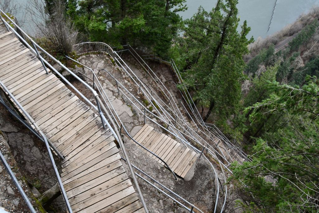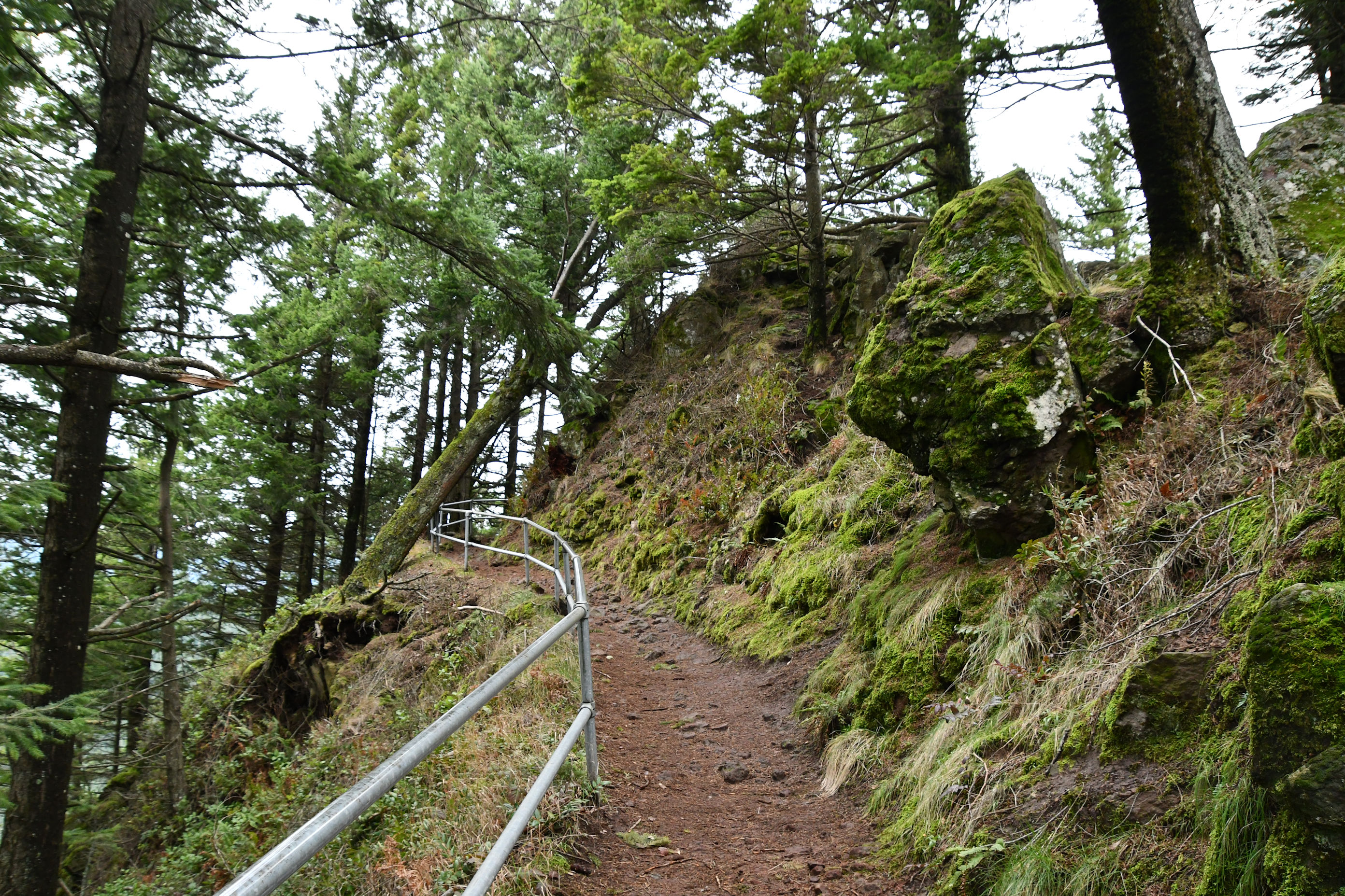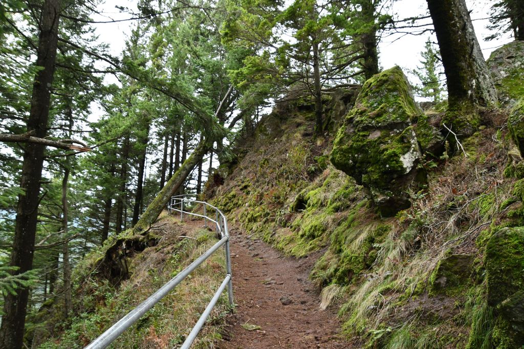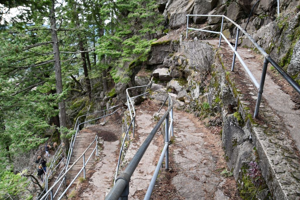 Hikers climb the west-facing side with concrete, wooden, and metal structures keeping us safe. It was very dramatic, but sheltered from the weather that day. Two-thirds of the way up, we wound to the east-facing side, which was forested and had trees and dirt to cut a path through, but we were BLASTED with wind.