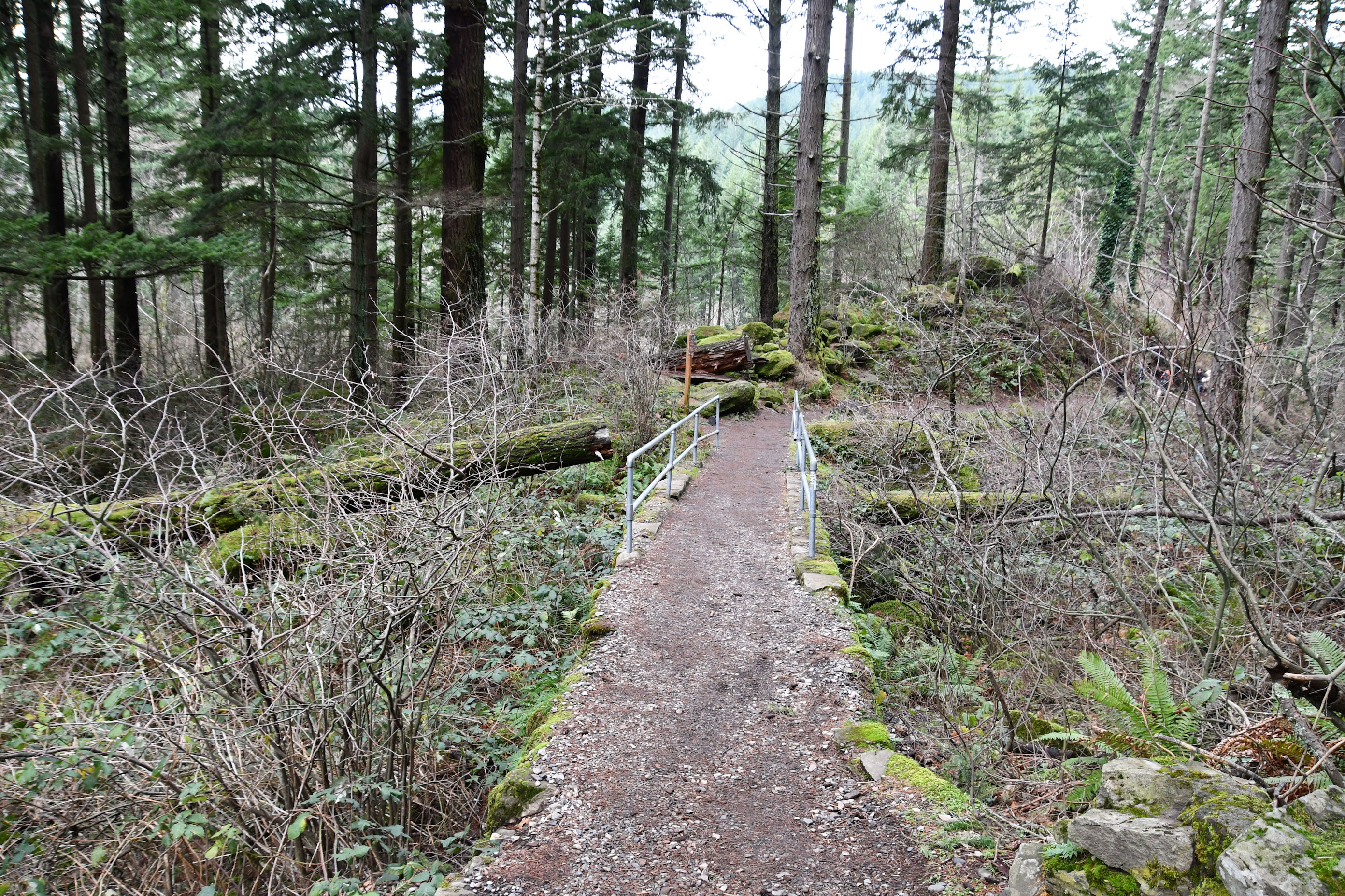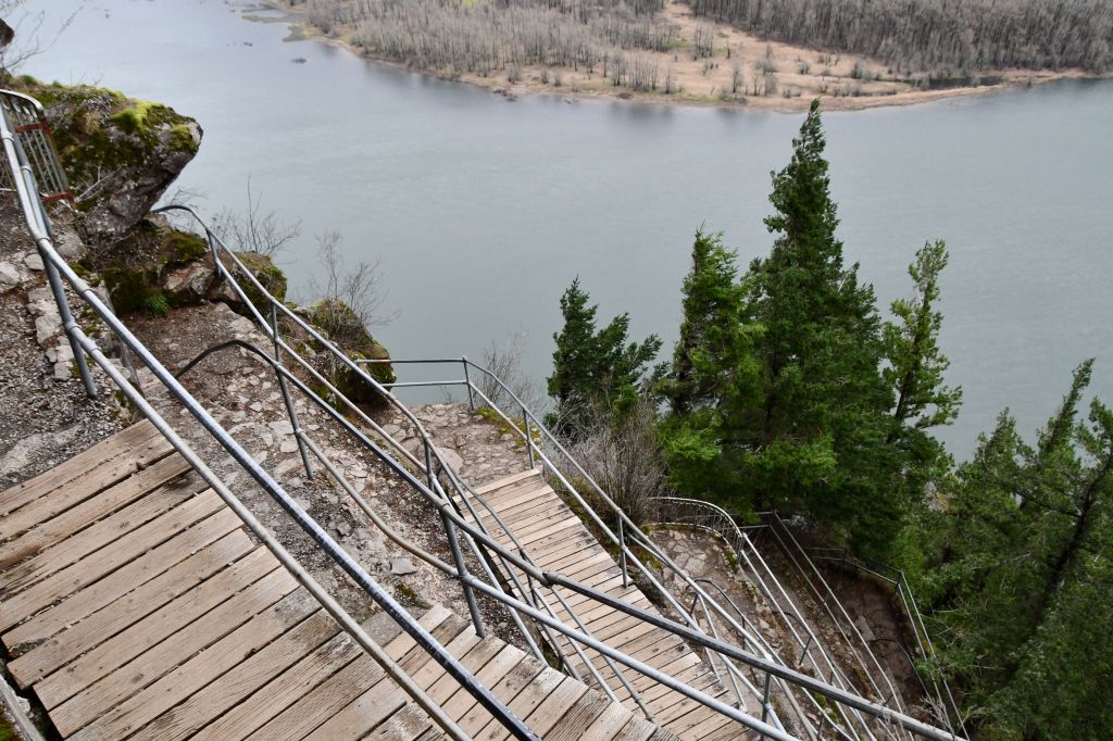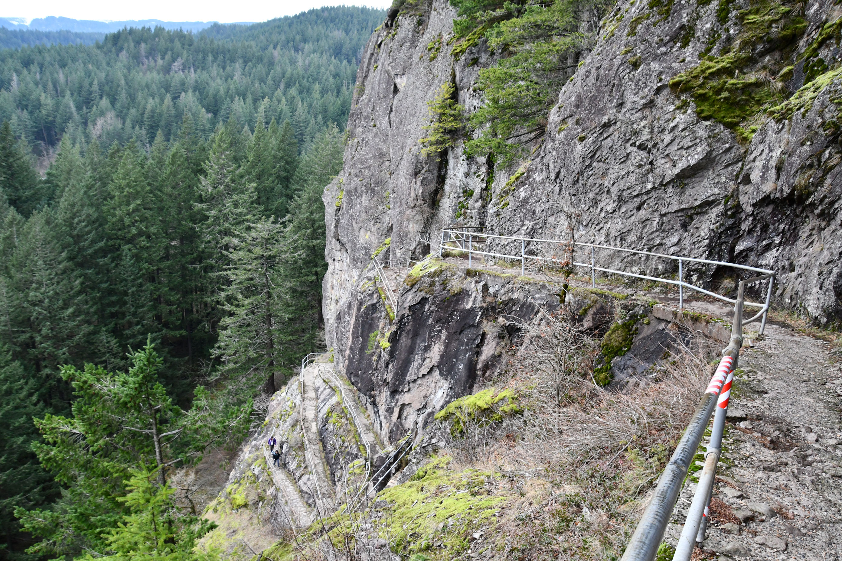 Hikers climb the west-facing side with concrete, wooden, and metal structures keeping us safe. It was very dramatic, but sheltered from the weather that day. Two-thirds of the way up, we wound to the east-facing side, which was forested and had trees and dirt to cut a path through, but we were BLASTED with wind.