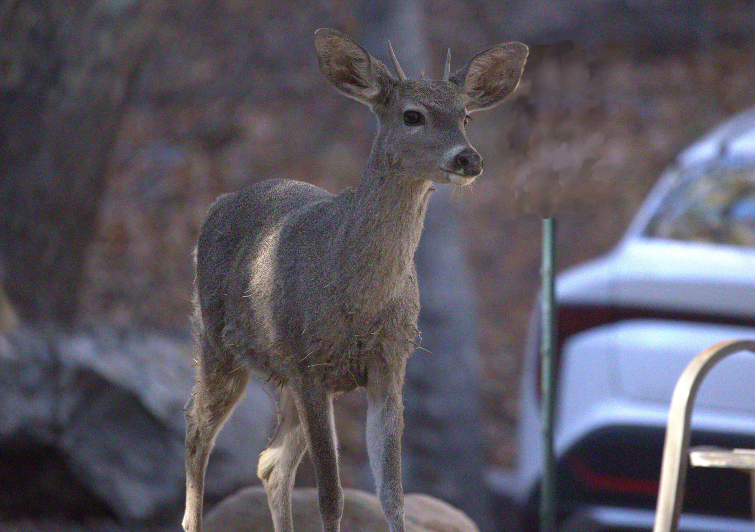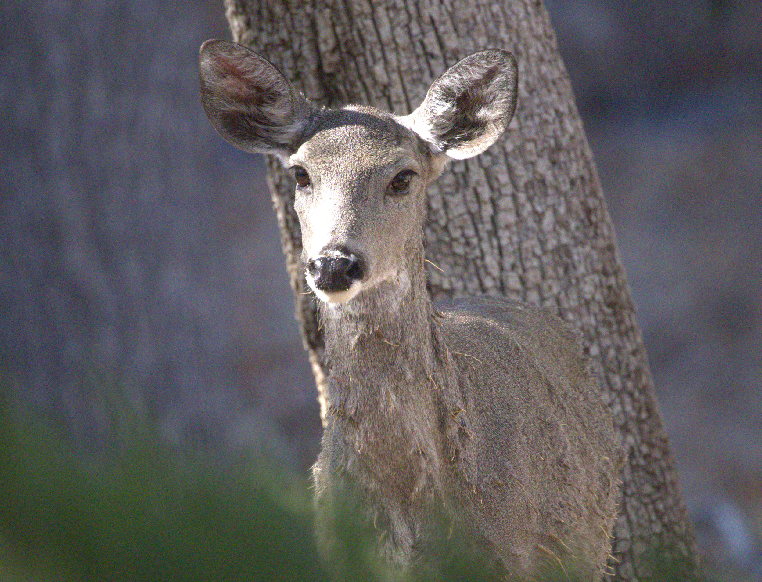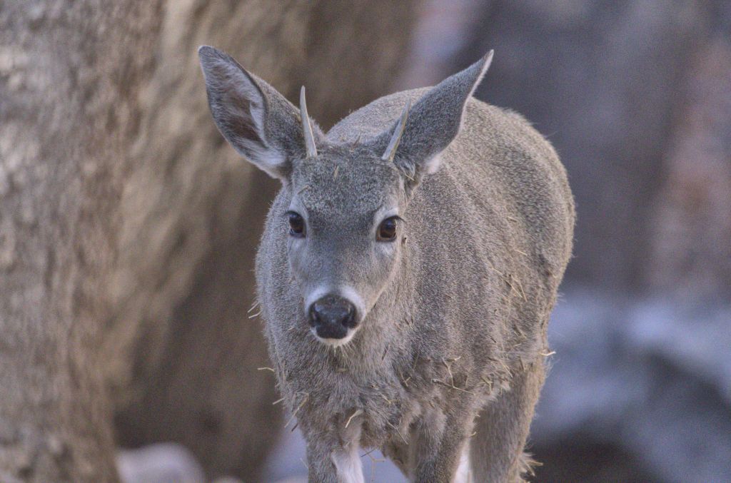 After we had taken dozens of shots of the turkeys, we walked farther along the road, and had to stop for Coues Whitetail deer passing right in front of us. It looked as though they had slept the night before in some rather grabby weeds that had attached themselves to their coats. What a mess those poor deer were.