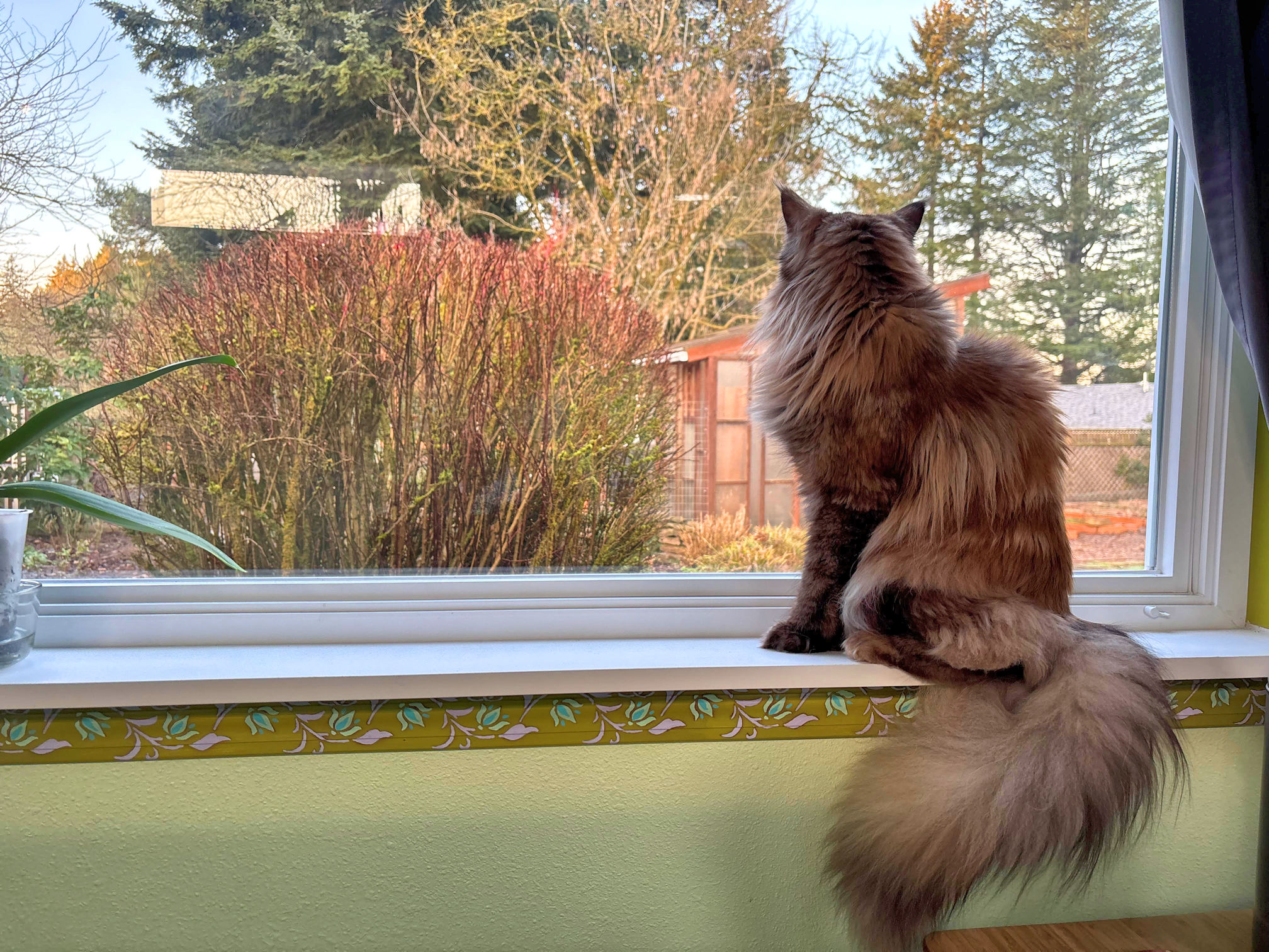 I brought kitty out here to my office this morning, to keep her from bugging Pedro, who was trying to sleep a little more. She was not having fun at all until she realized how many critters she could see through the giant windows out here. Like the many hummingbirds buzzing around.