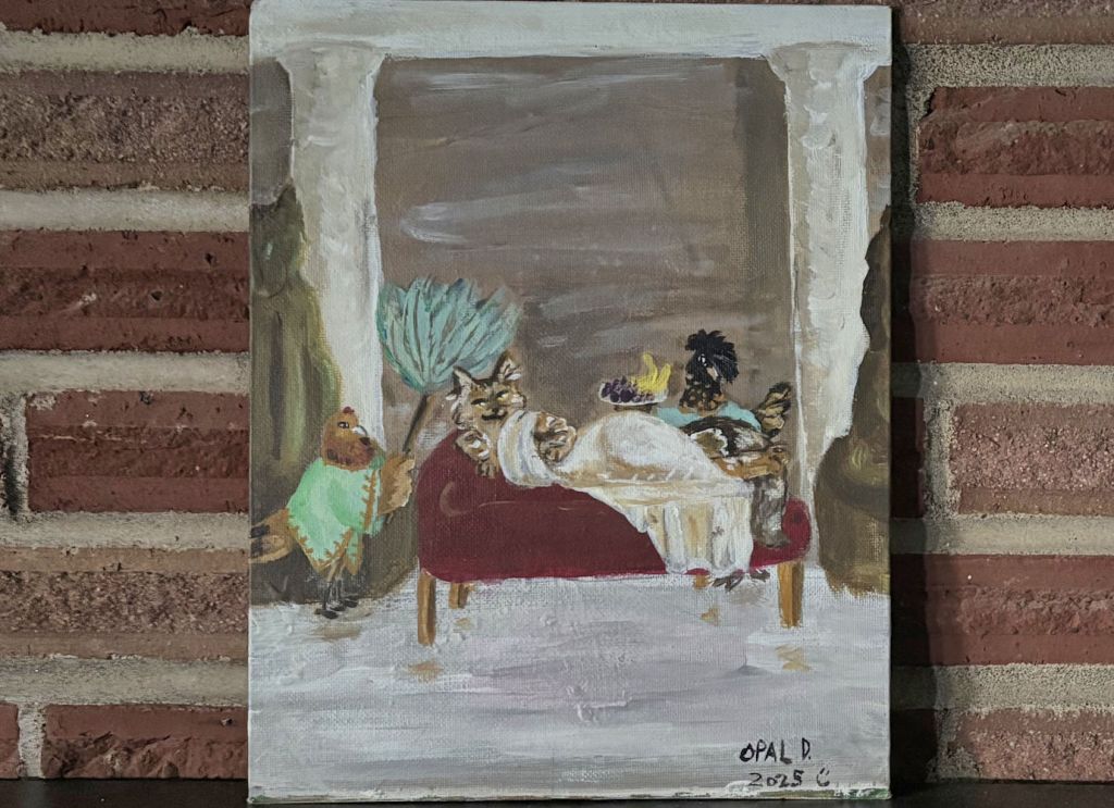 For my birthday in January, one of my friends commissioned a painting for me from a 13-year-old in her life. What an absolutely great gift it was! An acrylic painting titled “Jupyter being waited on by Maya and Cyndi.”