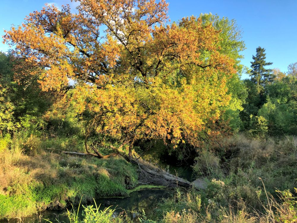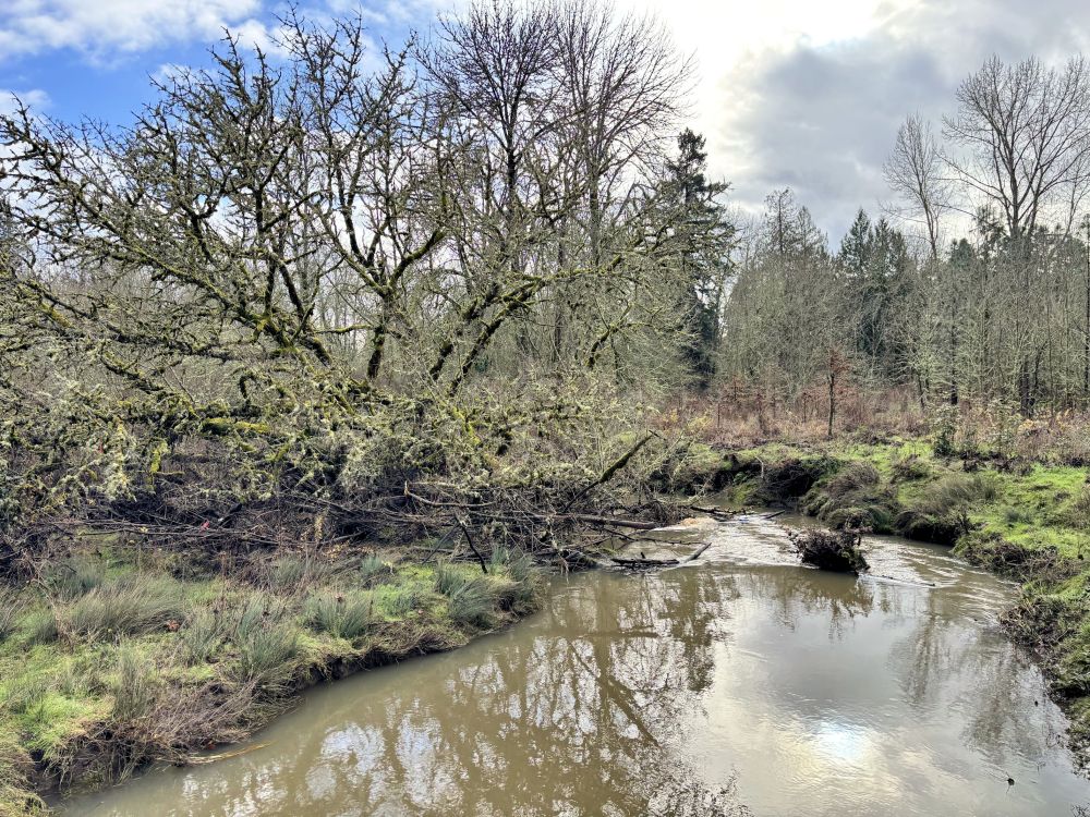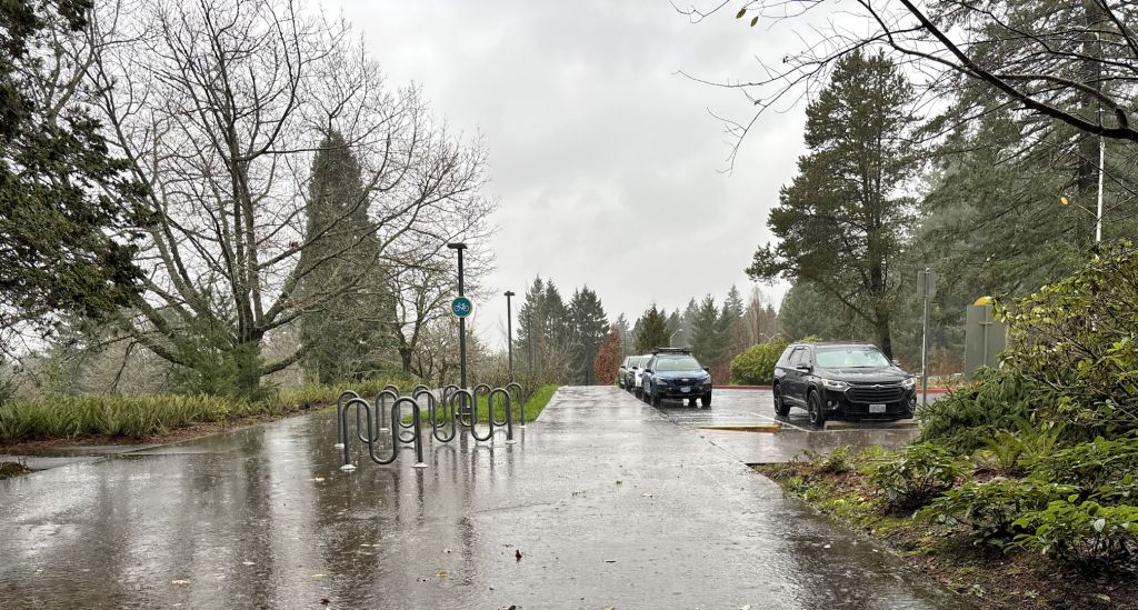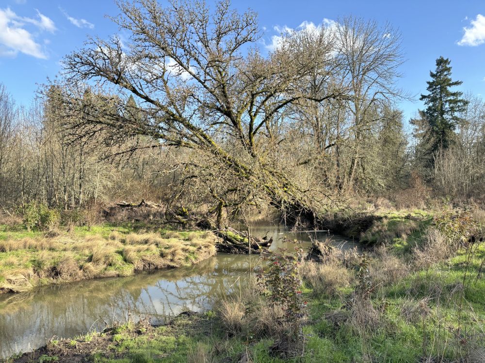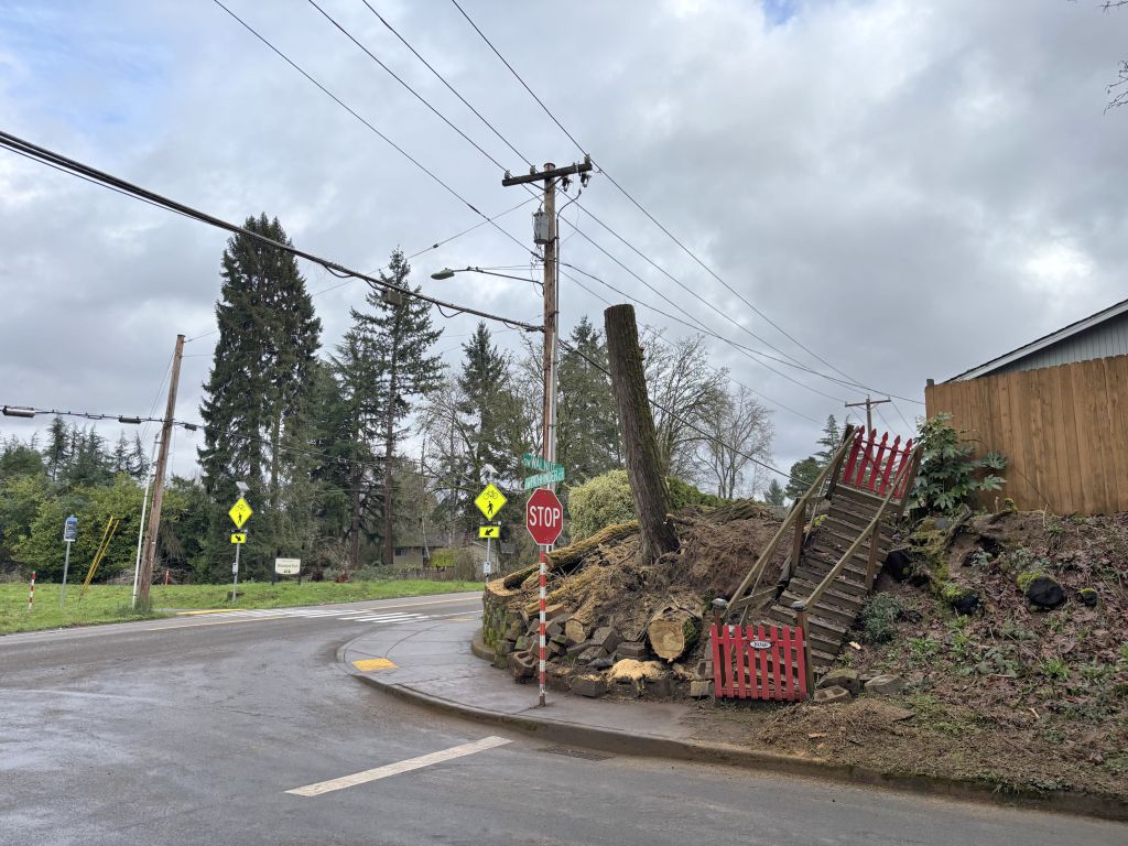 In the photo above, you can see where the trail crosses the road. Then the trail continues around this corner for one block along this street, around what used to be three big trees. During the aforementioned rainy and windy weather, this group of trees came down onto the power lines. We lost power, and we also lost this route to Pacific Highway from the house, as it was closed for two days while it was cleared and repaired.