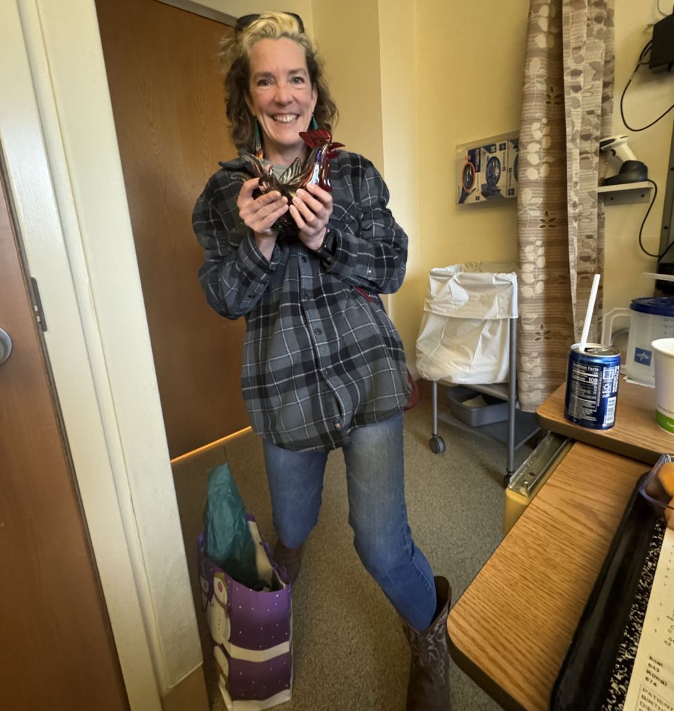 One of my friends spent an unexpected six days in the hospital. So awful. She was having trouble breathing. Doctors still don’t know what’s causing the problem, but they have figured out a strategy to keep her breathing, so she could go home. I stopped in to see her because hospitals can be the most boring place to spend time, especially when you can’t breathe and have to stay in bed most of the time. I included the photo because it’s one of the few I have of myself lately.