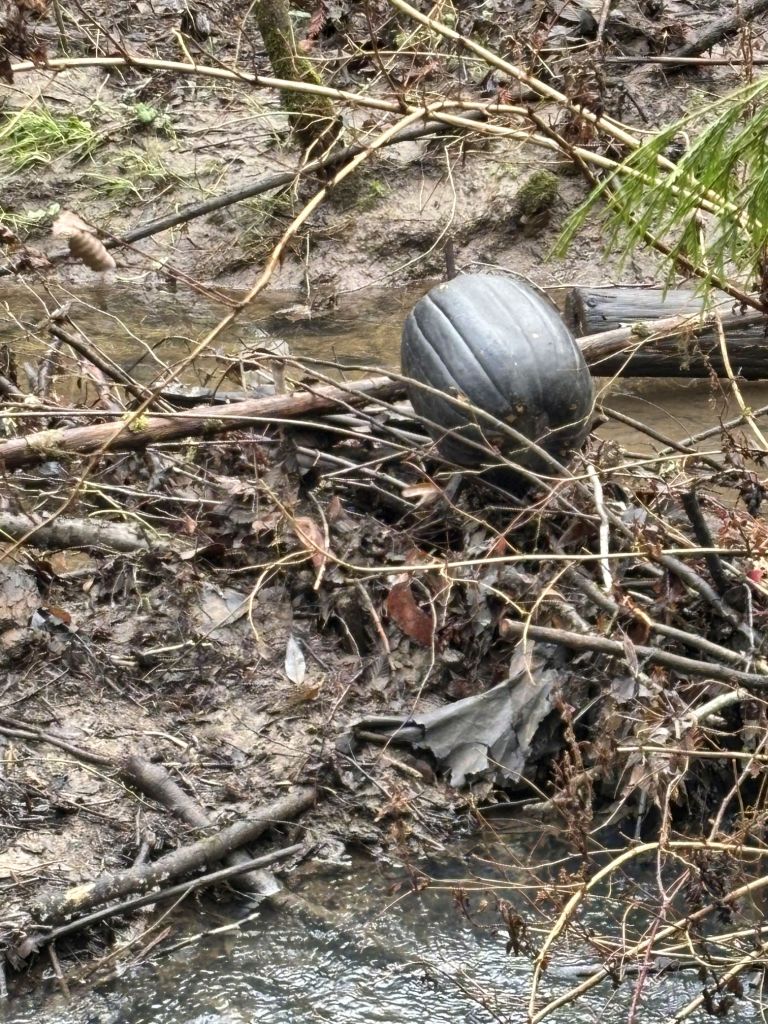The scene above caught my eye immediately because this is close to the house and we walk this section of trail several times a month. This gigantic oak has been leaning drastically since we moved here, and that has concerned me. We had tons and tons of rain, then a windstorm, and the tree couldn’t hold itself up anymore, with roots clinging to soft mud. I dug through old photos and found some to show you how it has changed since we moved here.