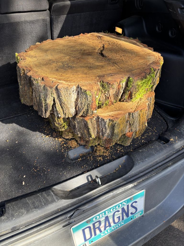 A couple days after I took the photo above, I drove past and saw a sign that said, “Free wood, please take.” I got my man and we drove over there. Pedro and I have been wanting slices of logs so we could practice axe throwing. Yes! It’s a fad that has become popular around here, and they charge you $20 for three tries and we are terrible at it, so it’s completely unsatisfying to spend that $20. A brand new hatchet is probably $20, so we thought “If only we could find a chunk of wood to throw it into!”