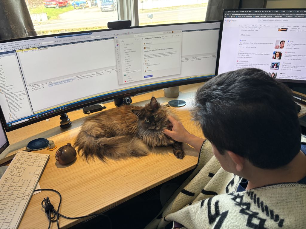 Yes, she figured that one out already. As you see, Pedro moved his board off to the side. It’s wireless, and sometimes I come into his office and find the keyboard on his lap while Jupyter is stretched out on the desk. Oh my. She is a princess.