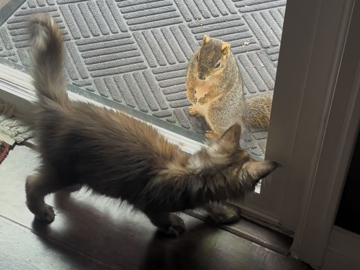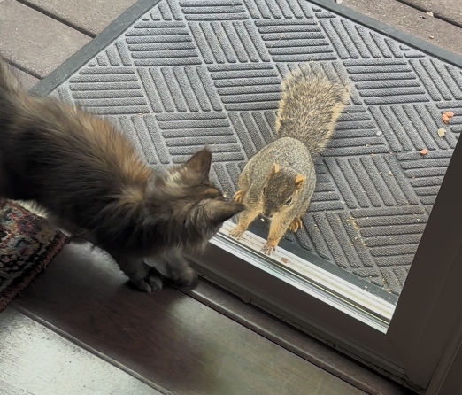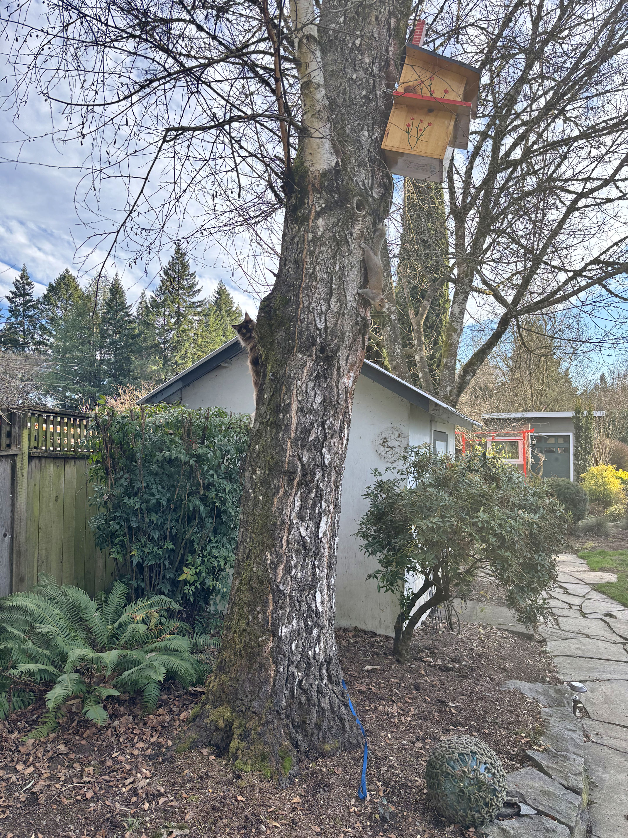 Why didn’t Boh run away? Well, she has not learned that Jupyter is bad. They come within two inches of each other, on either side of the glass sliding door, nearly every single day. When Pedro and I hand feed peanuts to her, we put one hand on the cat to keep her from pouncing, and feed the squirrel with the other hand. So Boh is cautious, but not properly afraid. I think she will stay safe. Jupyter has no hunting skills, only chasing skills. This was her first time climbing, and she was stuck right there where you see her. I had to walk over and pick her off the tree and put her down.