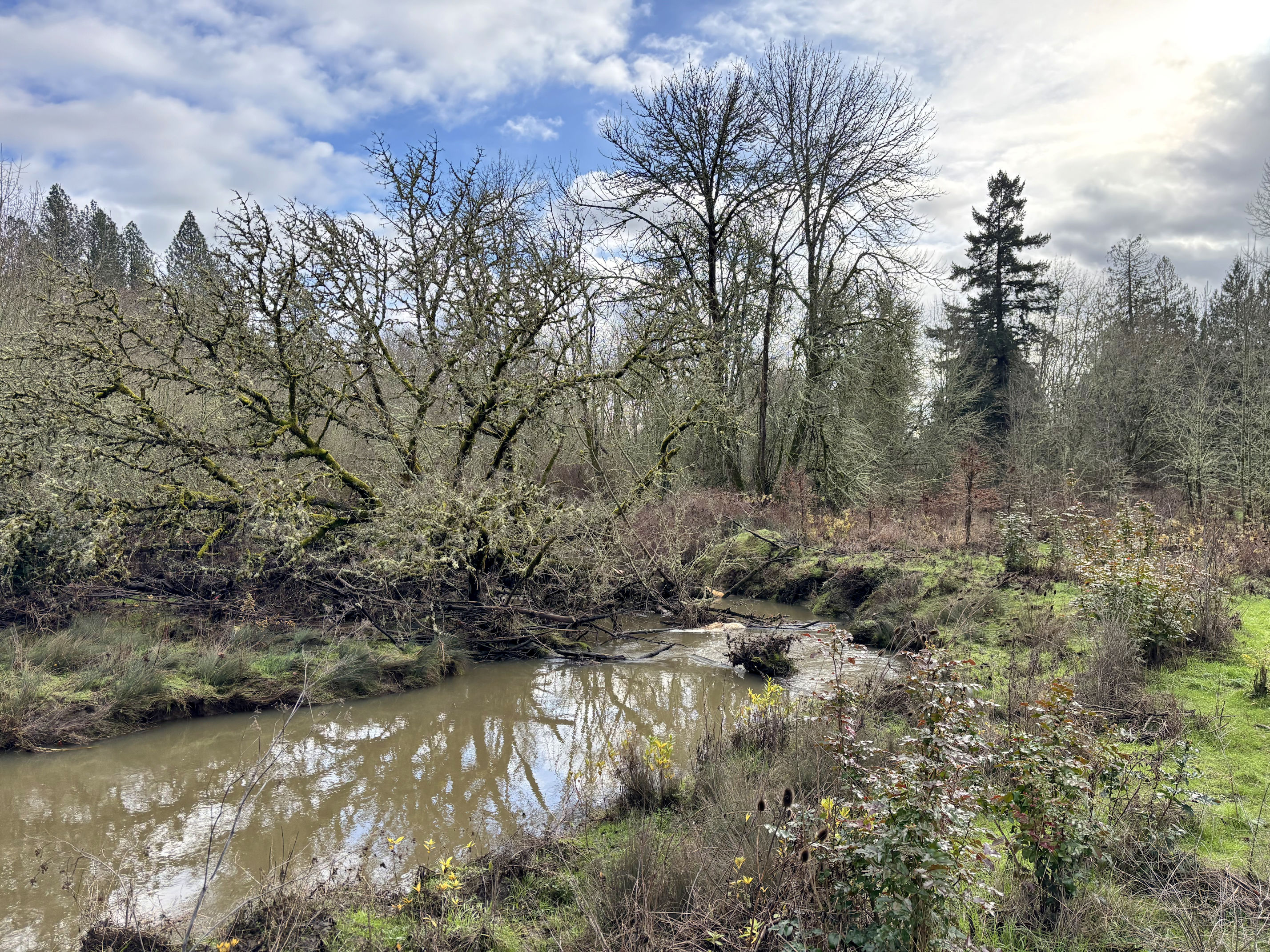In the photo above, you can see where the trail crosses the road. Then the trail continues around this corner for one block along this street, around what used to be three big trees. During the aforementioned rainy and windy weather, this group of trees came down onto the power lines. We lost power, and we also lost this route to Pacific Highway from the house, as it was closed for two days while it was cleared and repaired.