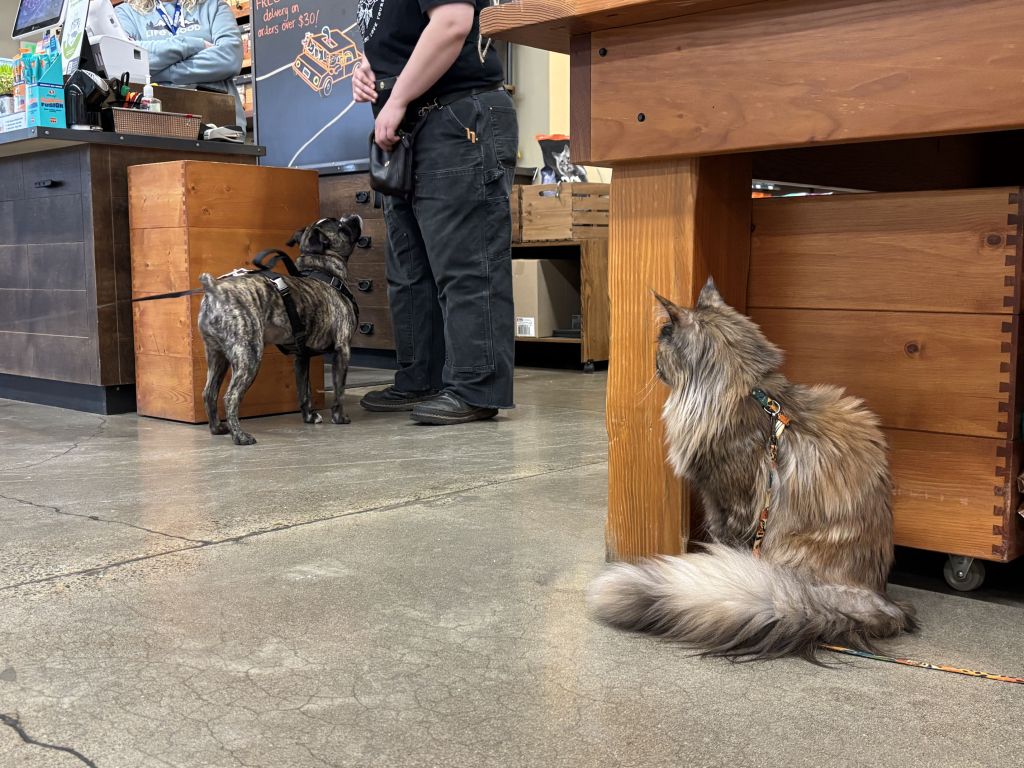 Jupyter needs more and more stimulation every day. Sometimes I take her to the pet store Mud Bay, and let her run around and meet other animals. The staff is great and she is extremely chill, as you see here.