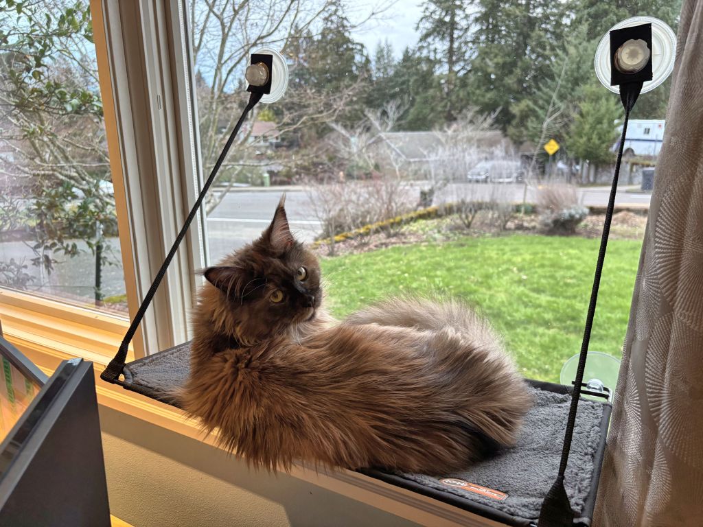 Our one-year-old cat has become needier, and we are kept on our toes, trying to find new ways to keep her entertained and out of our hair. She reminds me of a Chesapeake Bay Retriever I had once, that had unbelievable levels of energy. We would take him for runs on desolate roads through the mountains and drive in the car while he ran beside. It was the only way to ever tire him out. Jupyter has been annoying Pedro by needing to be on top of his desk and in front of the cameras during his many video meetings. I suggested a window shelf, mounted high enough so that she can watch him and also watch outside. It was an immediate hit.