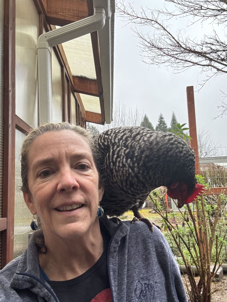 The old location for the hens was a dog run, and the previous owners had put down river rock, which holds up well in the rain. The new location has no rocks, just clay soil, and has turned into an oozing slippery cesspool on a hill. So awful. To date I have not slipped and sat in it, but the fear haunts me. The hens still have the chicken tunnel and can run down the length of the property back to the dog run, where there is a covered area, and I sprinkle their scratch grains on the dry ground. I am sure all of us are eager for Mother Nature’s spigot to turn off.