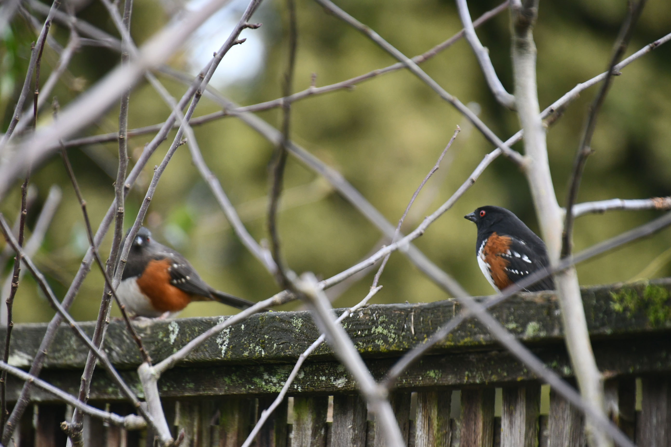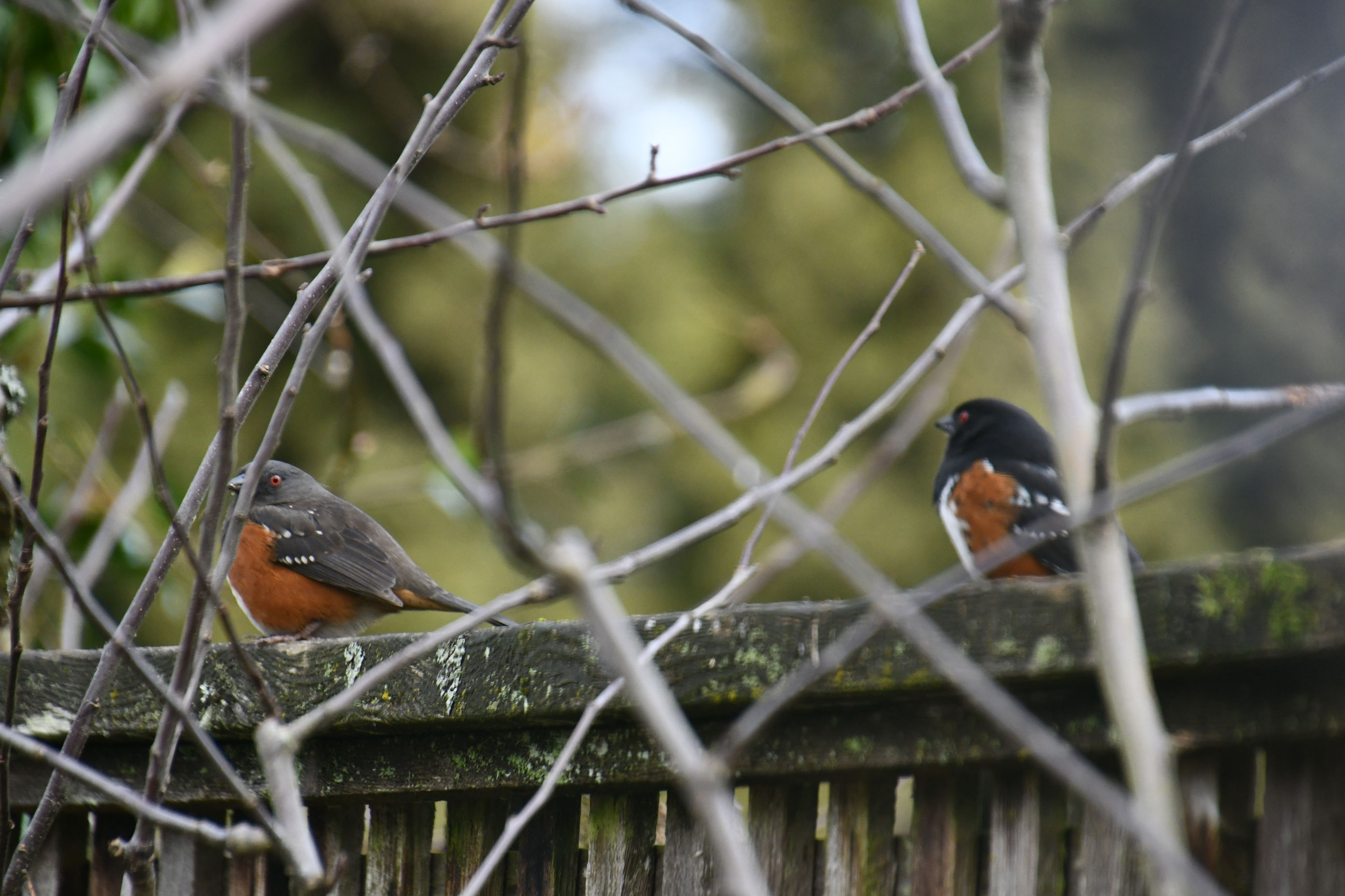 I’ve enjoyed witnessing the pairing up of wildlife for Spring, like the female (left) and male (right) Spotted Towhees.
