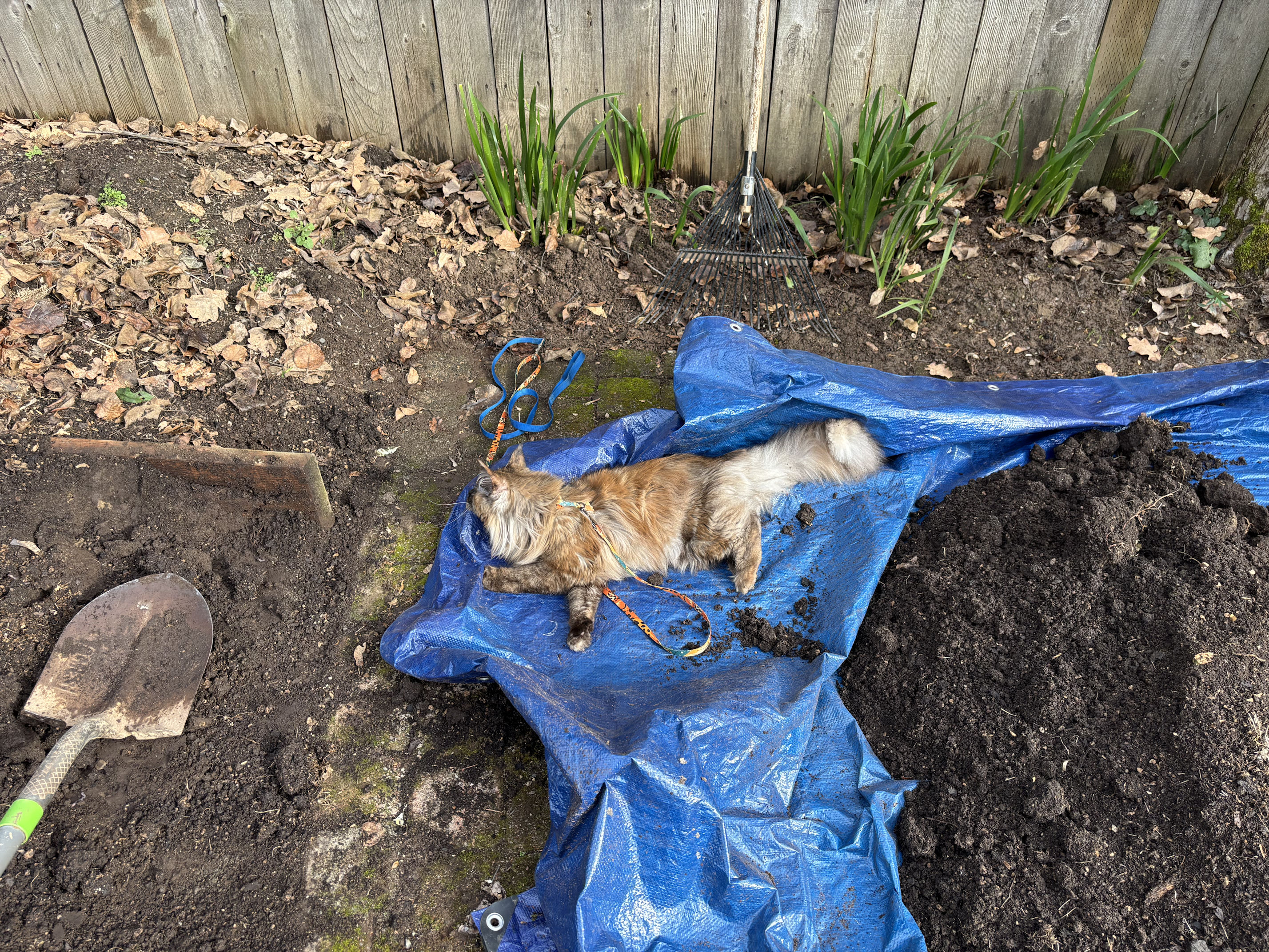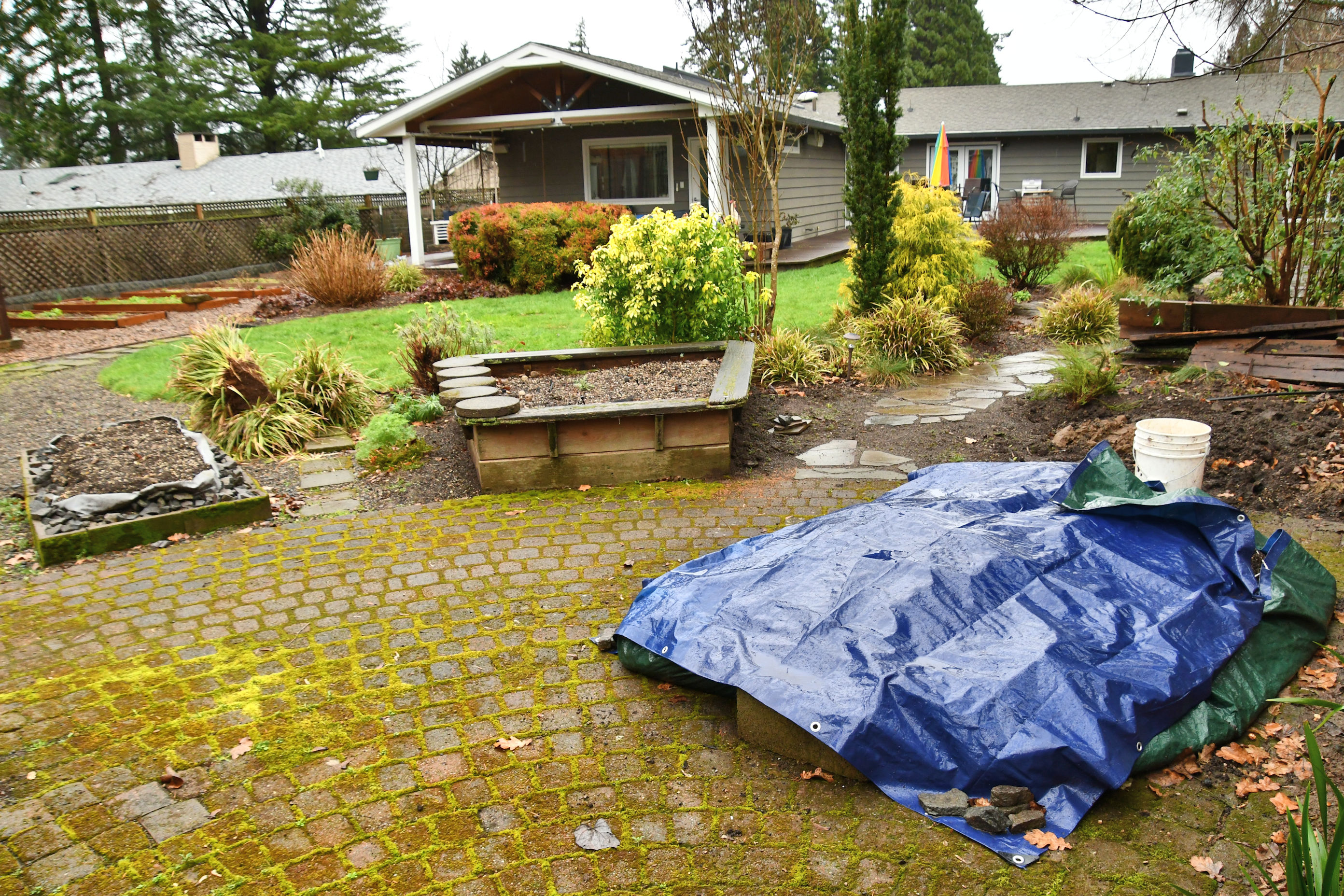 In the photo above, you can see the cinder block bed mostly disassembled on the left, one bed intact in the center, and a totally disassembled wooden bed on the right (boards piled at the base of the buddleia). The dirt is under the blue tarp so that it is protected from rain the rest of the winter. I pulled up some concrete circles that made up part of the walkway, and laid down slate rocks we found scattered here and there. We will have to find or buy a few more rocks to finish the path, but at least it now matches the rest.