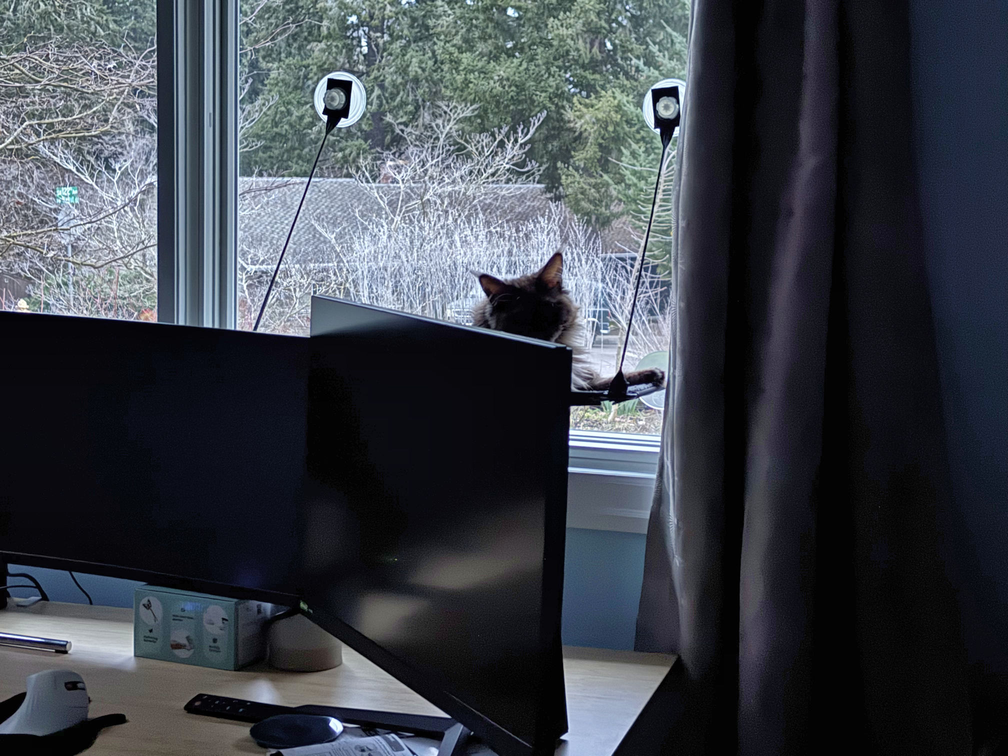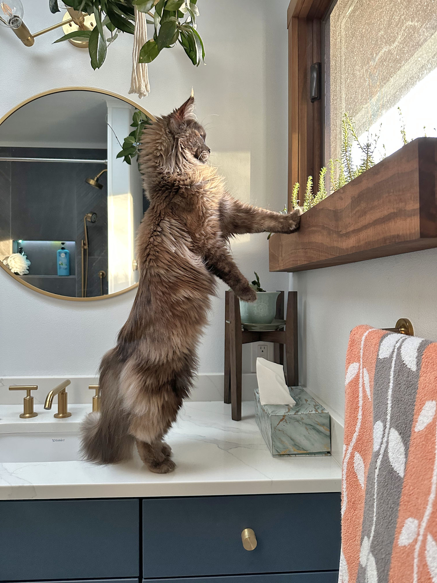Our one-year-old cat has become needier, and we are kept on our toes, trying to find new ways to keep her entertained and out of our hair. She reminds me of a Chesapeake Bay Retriever I had once, that had unbelievable levels of energy. We would take him for runs on desolate roads through the mountains and drive in the car while he ran beside. It was the only way to ever tire him out. Jupyter has been annoying Pedro by needing to be on top of his desk and in front of the cameras during his many video meetings. I suggested a window shelf, mounted high enough so that she can watch him and also watch outside. It was an immediate hit.