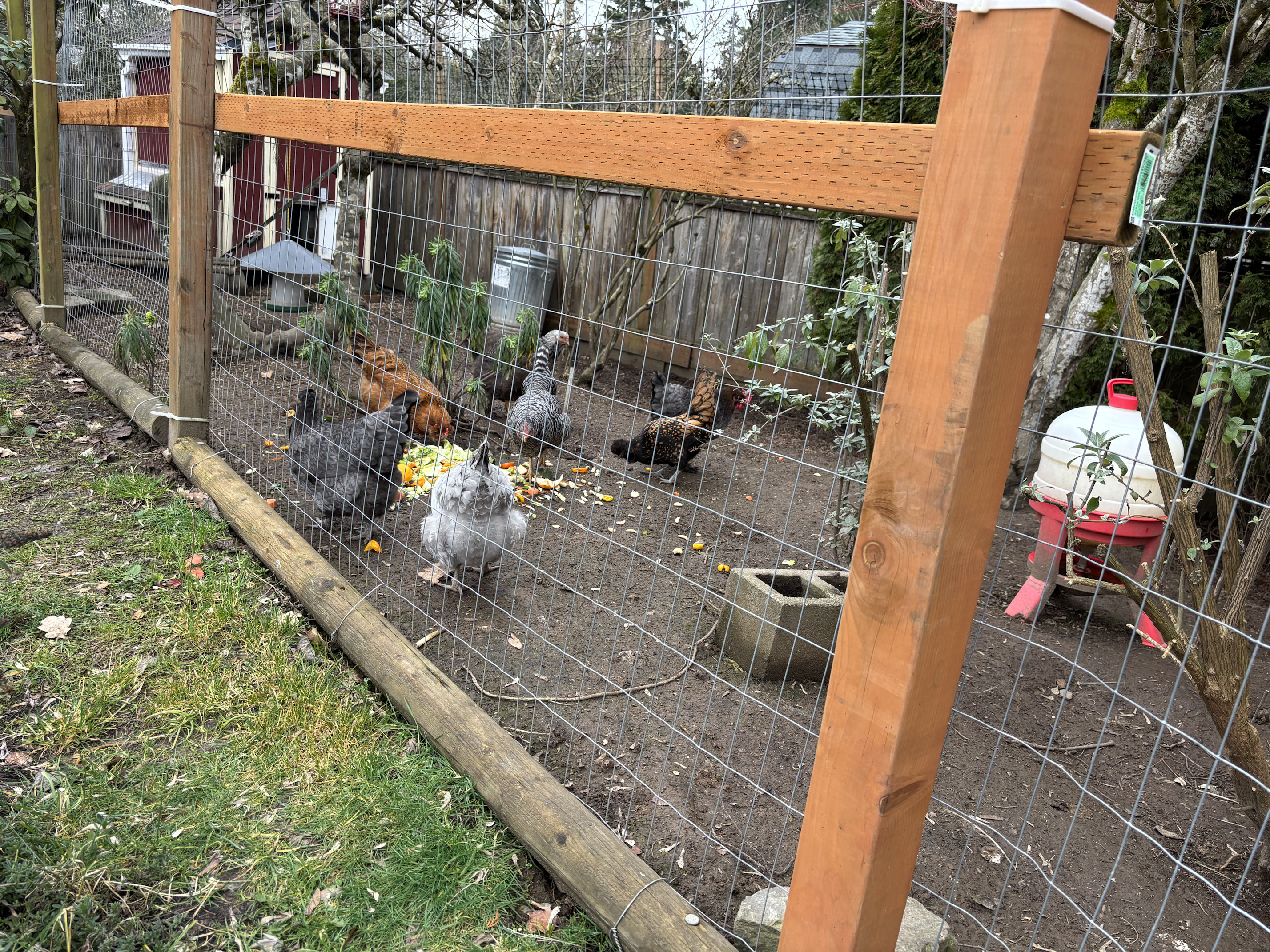 The old location for the hens was a dog run, and the previous owners had put down river rock, which holds up well in the rain. The new location has no rocks, just clay soil, and has turned into an oozing slippery cesspool on a hill. So awful. To date I have not slipped and sat in it, but the fear haunts me. The hens still have the chicken tunnel and can run down the length of the property back to the dog run, where there is a covered area, and I sprinkle their scratch grains on the dry ground. I am sure all of us are eager for Mother Nature’s spigot to turn off.
